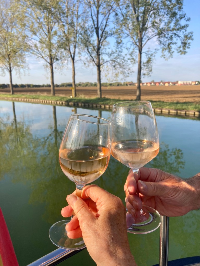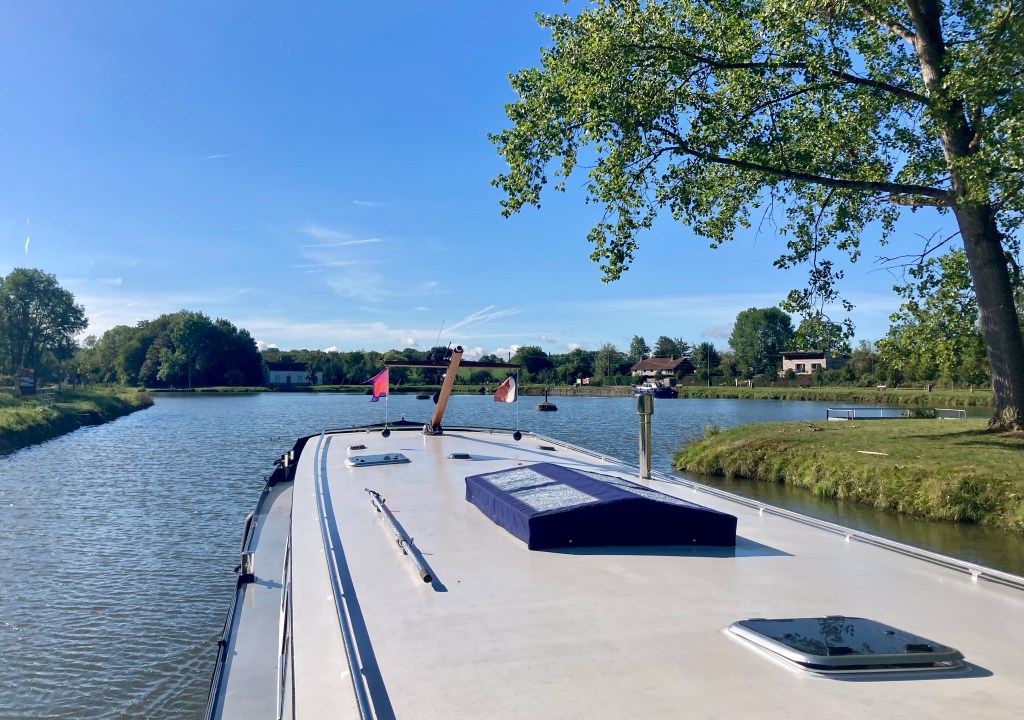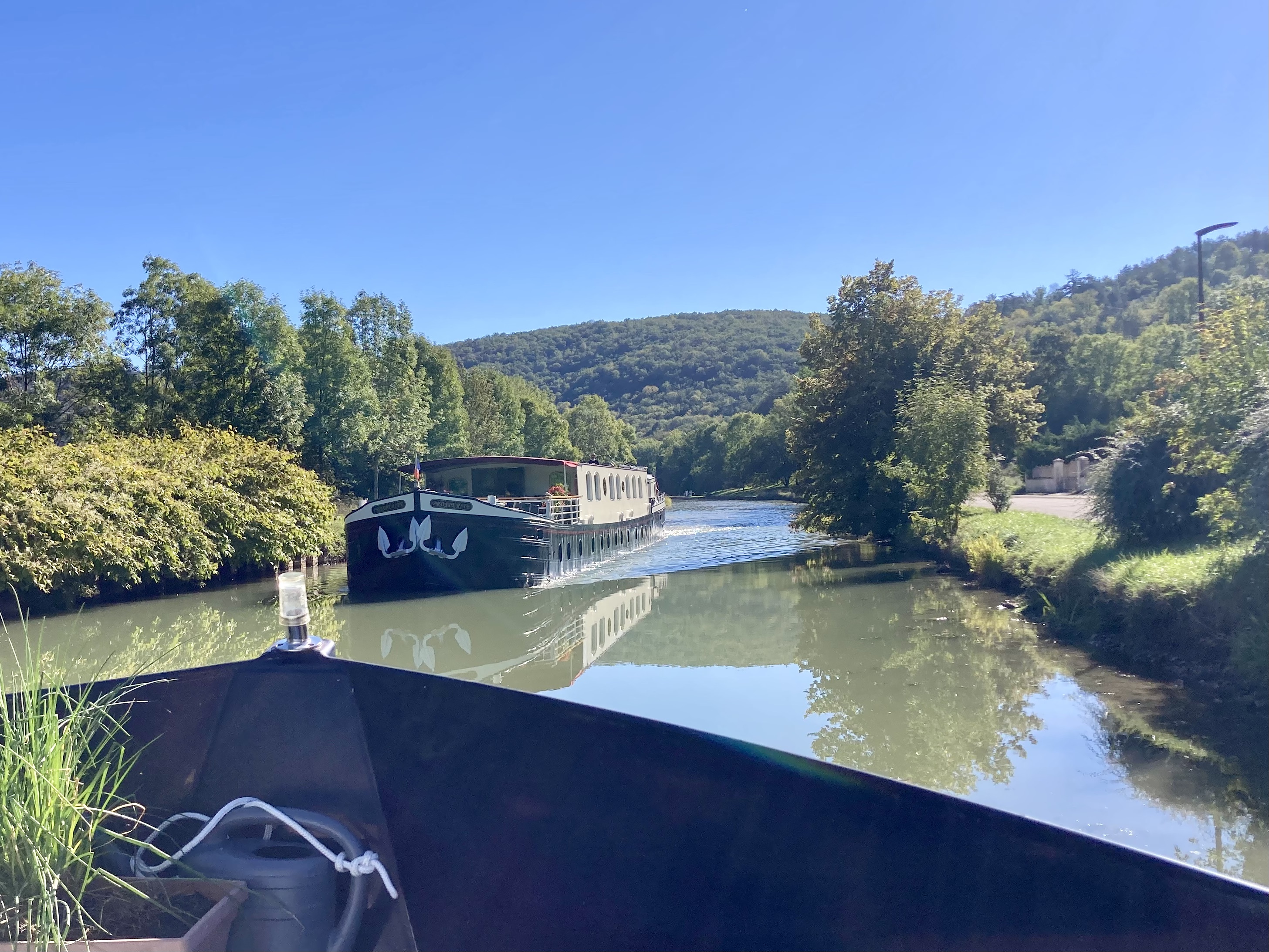Shortly after this we met a hotel barge coming upstream. It was quite a surprise. We had had the canal more or less to ourselves for days now. It’s normally a simple thing to pass one of these big barges, but a little more difficult with the lower than normal water. Both Captains took care and we glided past one another gently.