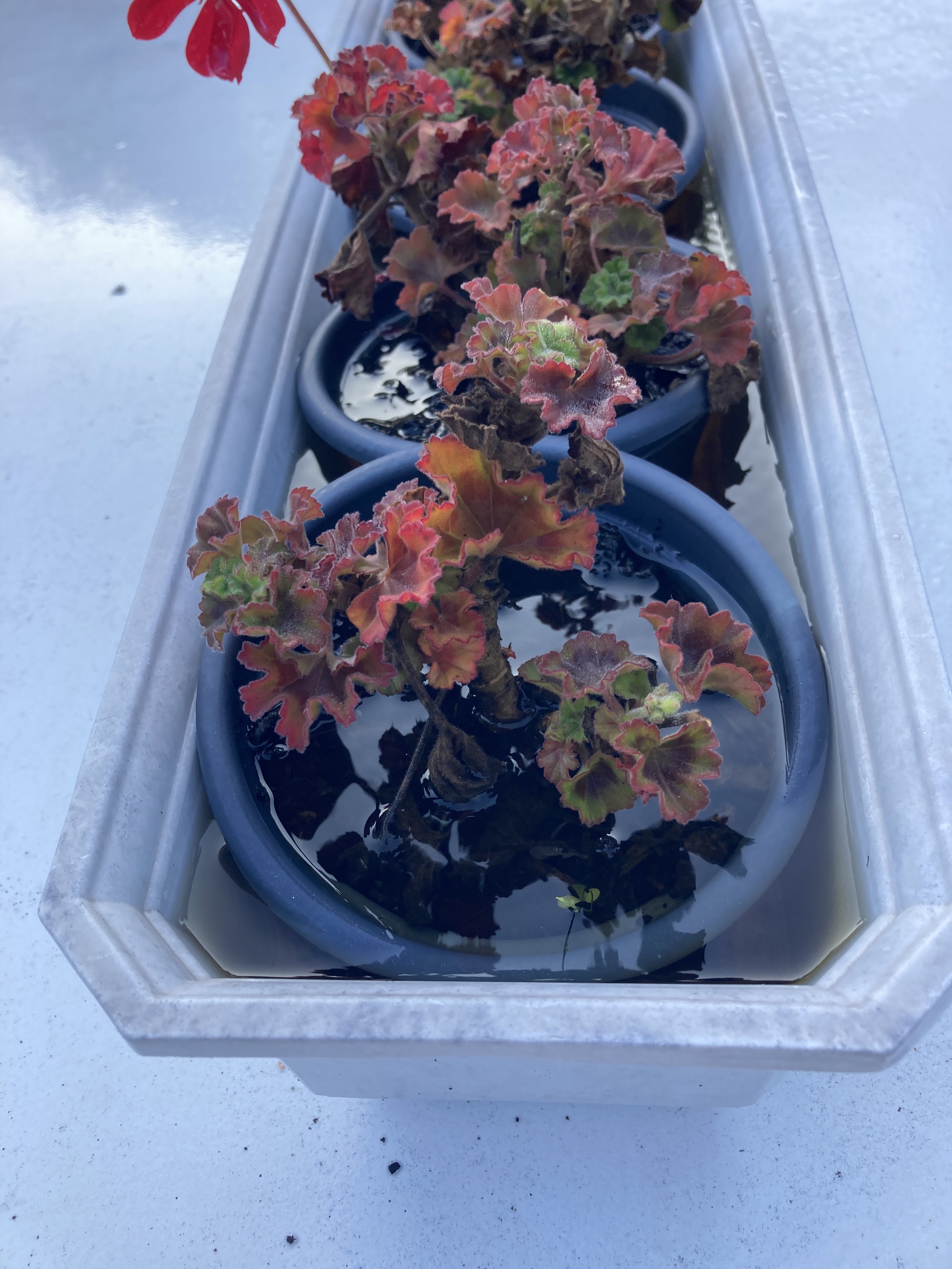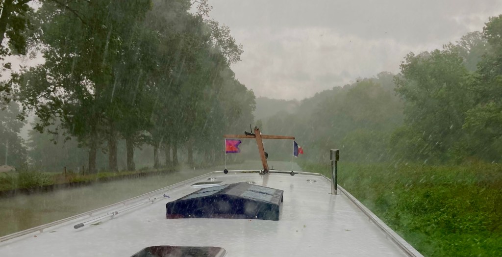 On going outside we found other after effects of the storm! The ropes were all sodden, so we strung them up to drip and dry. The poor geraniums were drowning! The water was not only full in each pot, but also to the brim of the trough. Quite a bit of emptying to do before we left Pont d’Ouche.