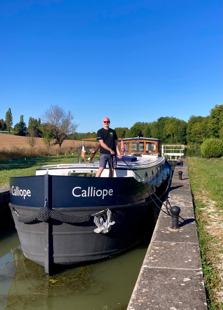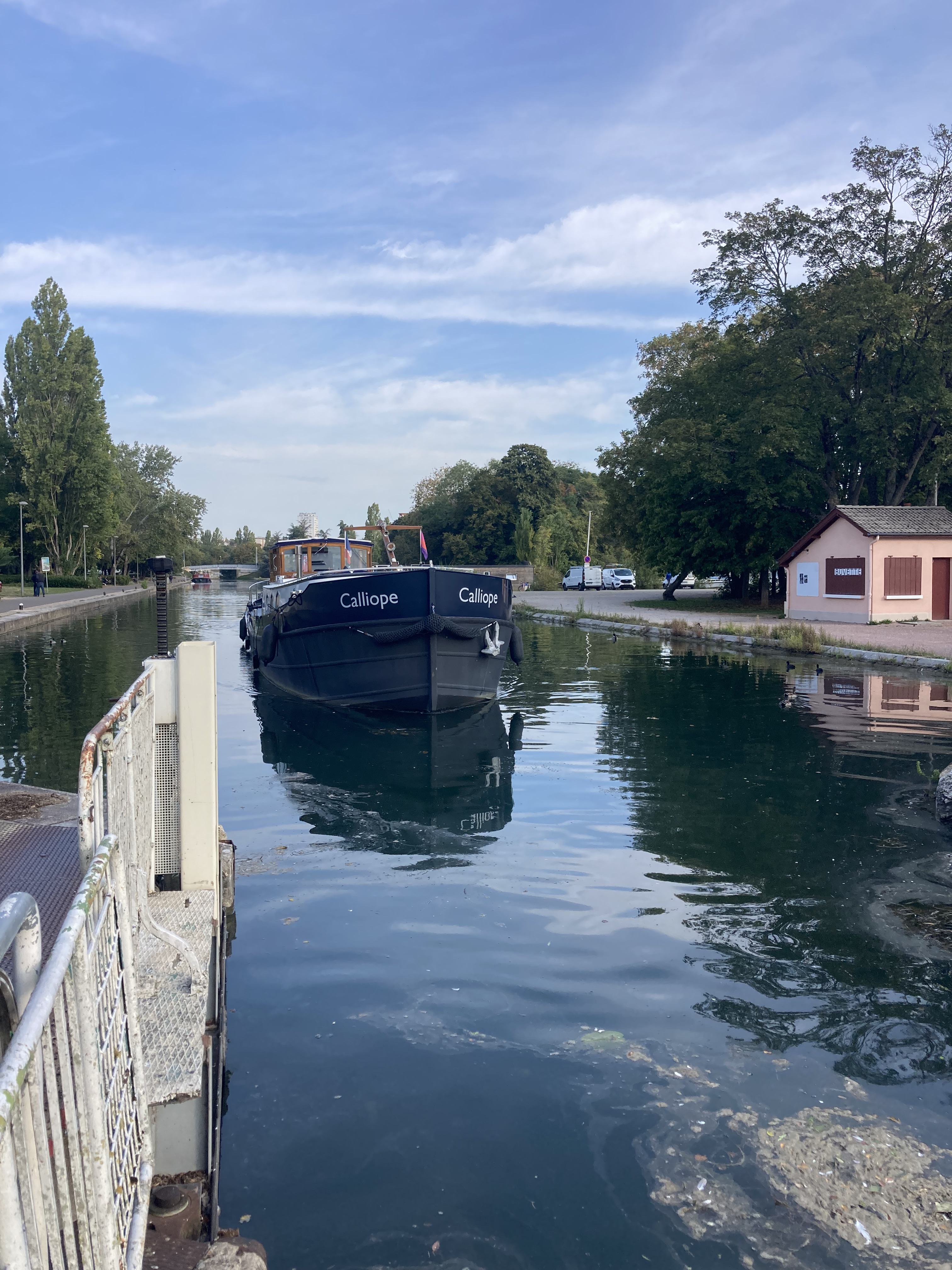 Stu set off at the wheel and I walked the two hundred yards from the mooring to the lock at the end of Dijon basin, allowing me to get a photo of Calliope’s approach.