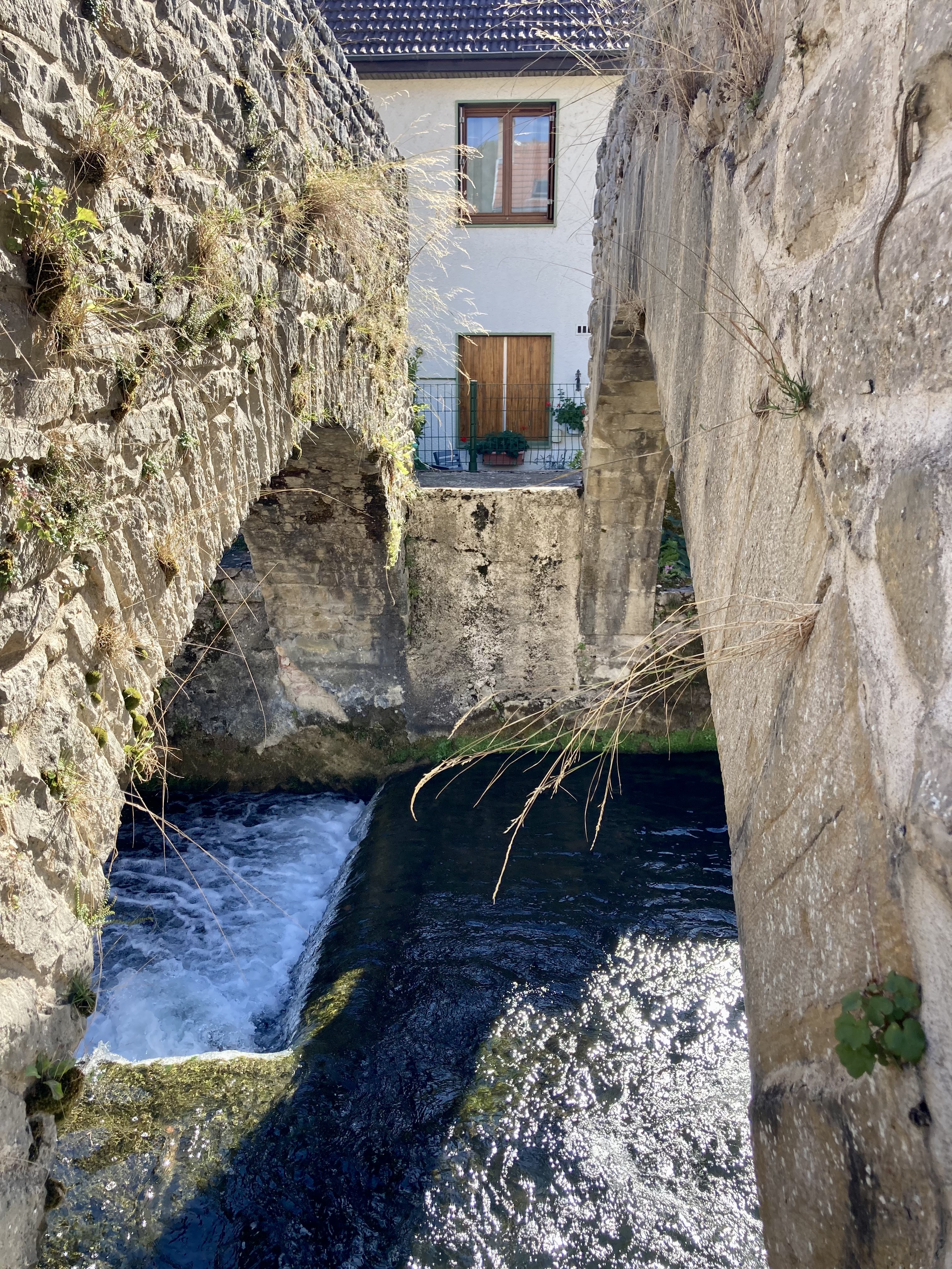 The lavoir is at the bottom of stone steps and in a sunny cobbled yard. The water is below a usable level these days, well below the sloping edging stones where village people would have knelt with their washing. At the back, in the arch, a stream gushes from the wall and comes under the cobbles to feed the lavoir.