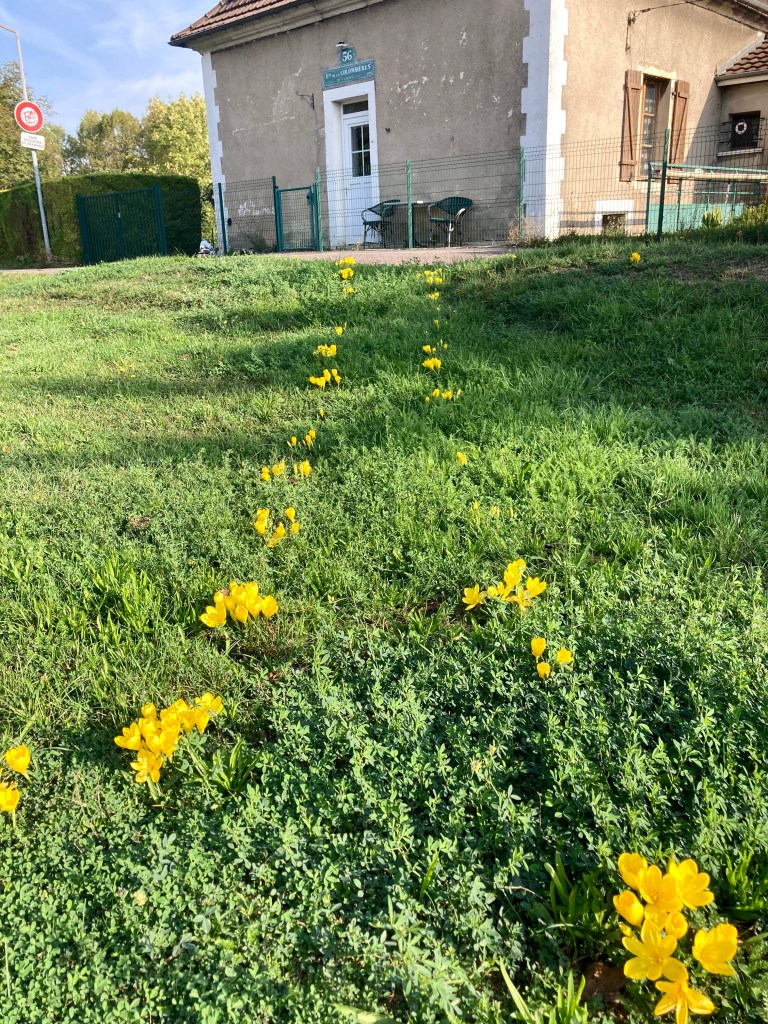 Three locks and 4 kms further brought us to the pretty little lock at Longvic. Two lines of autumn crocuses suggest an old pathway from the door to the lock gate.