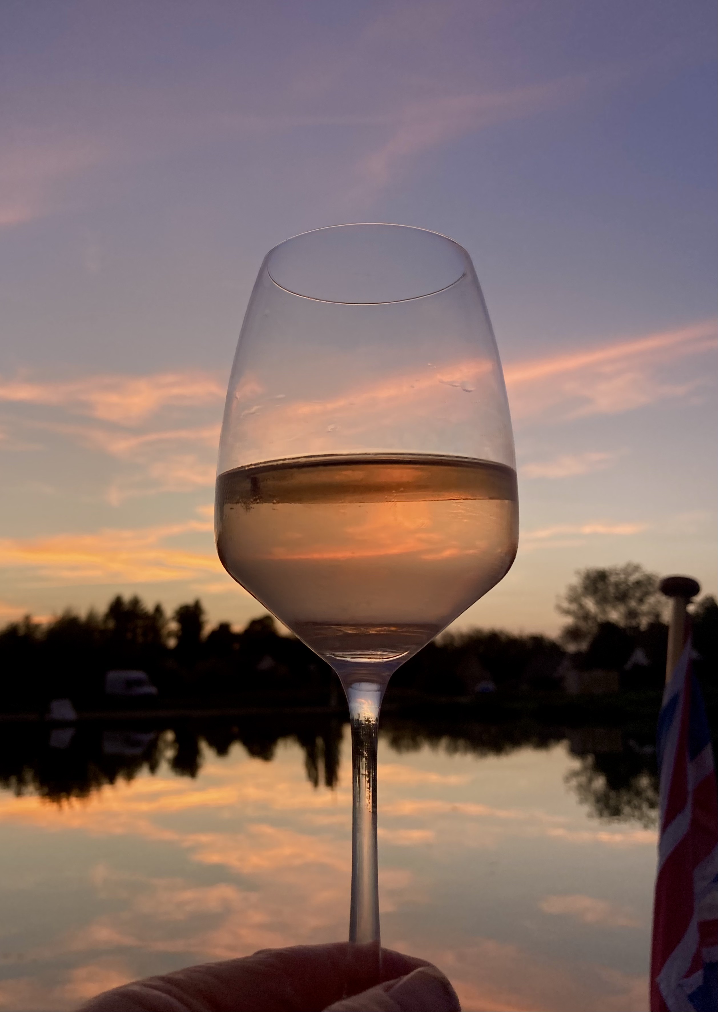 Half an hour later the sun had almost disappeared astern of Calliope and we enjoyed the next palette of colours across the canal, to go with a relaxing evening glass of wine.