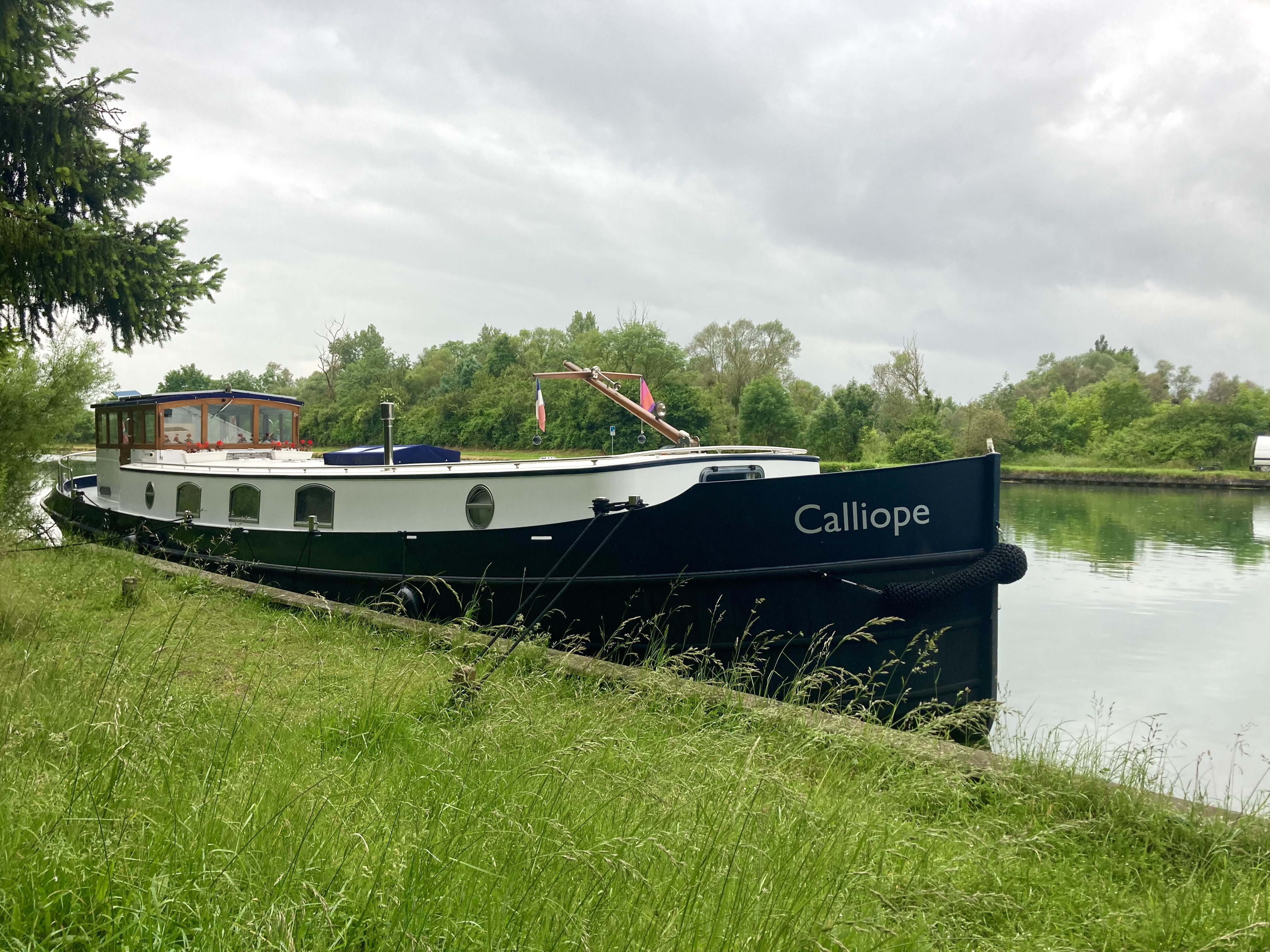 While we were eating a big working barge came by. This is the so called ‘Freycinet’ barge, designed and built to fit the locks on these older canals. She came by slowly and gently, hardly causing a ripple aboard Calliope.