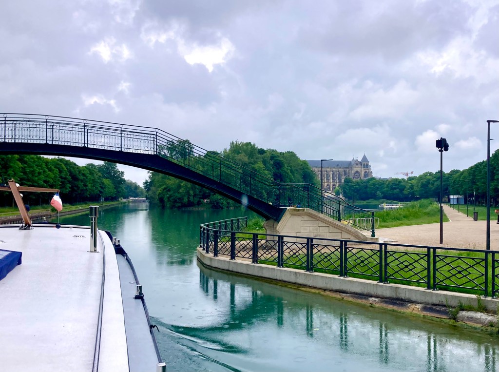 About an hour later two familiar sights hove into view; the paserelle from the Grand Jard to the Jard Anglais on the other side; and in the background the cathedral of Chalons-en-Champagne. We were within a few hundred yards of our mooring.