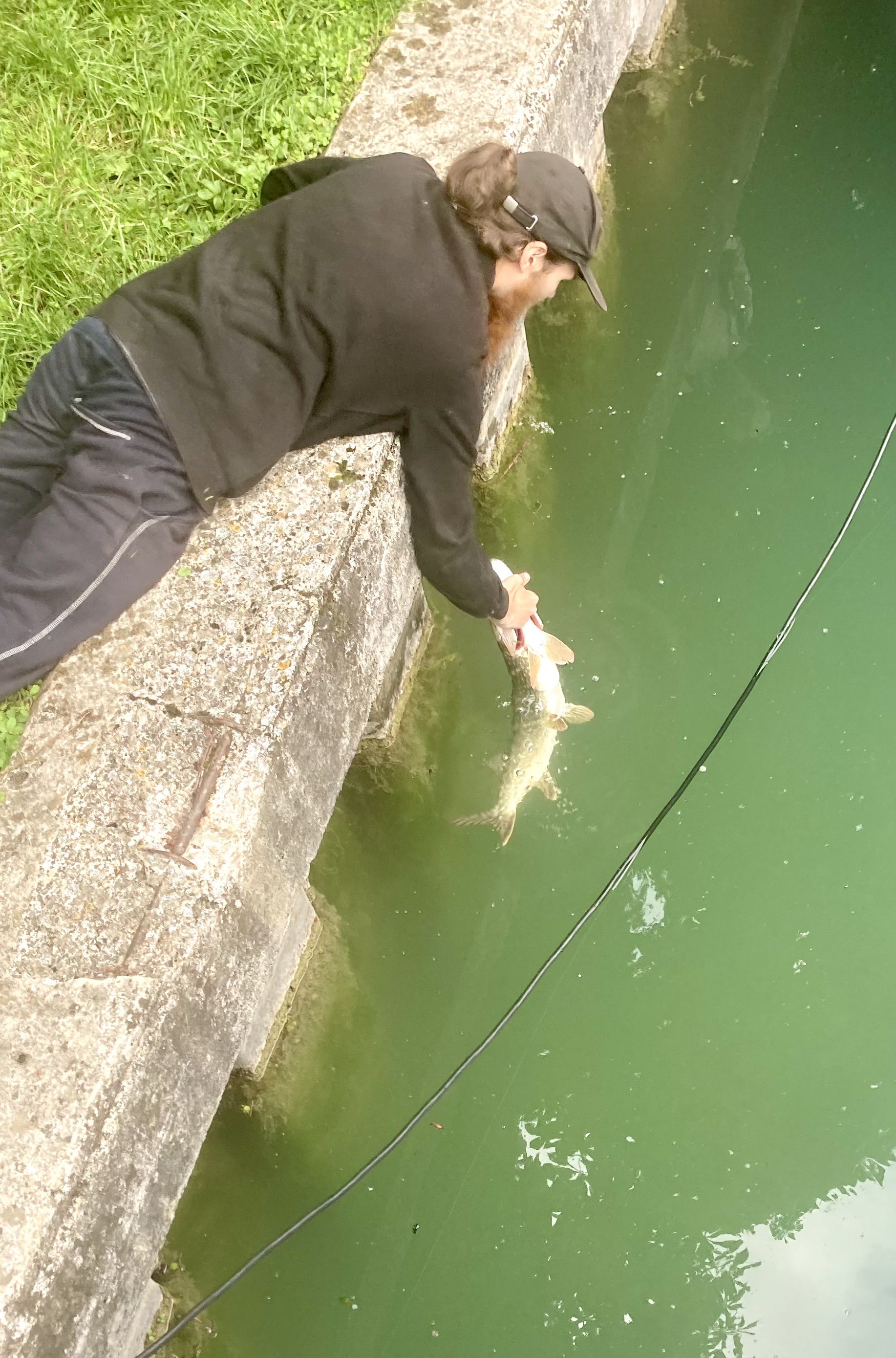 On the nature and sporting sides of things the quay is a popular place for fishermen and women. This young lad got very excited when he caught a big fish (pike?) right by our bow. Once he had got a few photos he carefully lowered it back into the water and gently stroked water through its gills until it recovered from the shock, and with a quick twist and splash it was gone.