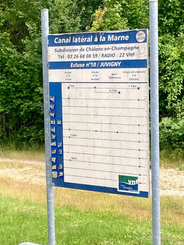 Then we were at the junction, complete with good signpost informing us that straight on went to Écluse 12, Tours-sur-Marne, and onwards on the Canal Lateral à La Marne.