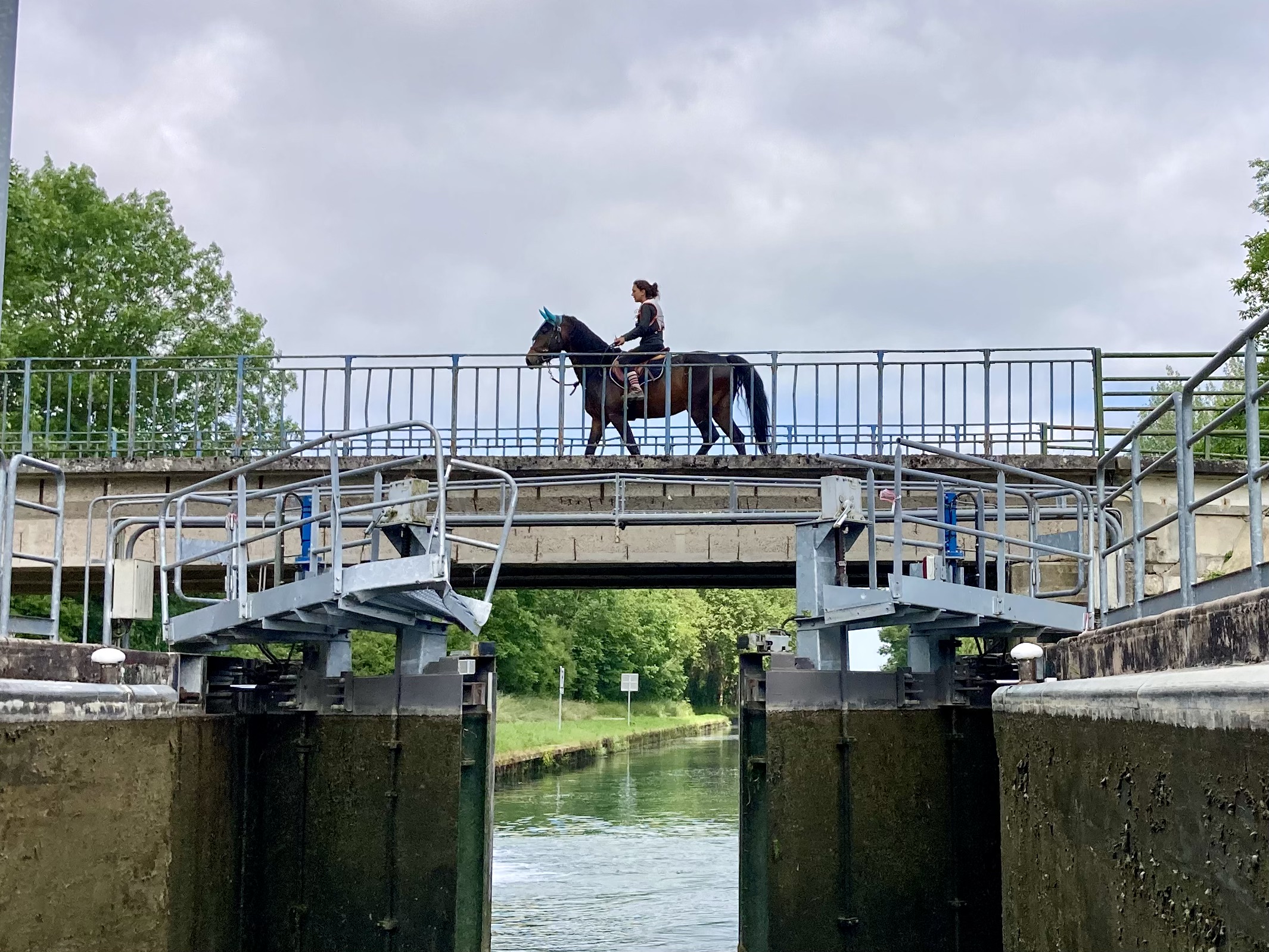 At this same lock, at Vraux, a young lady riding a sprightly horse came to cross the bridge just as the lock doors began to open with a bit if a creak and groan.