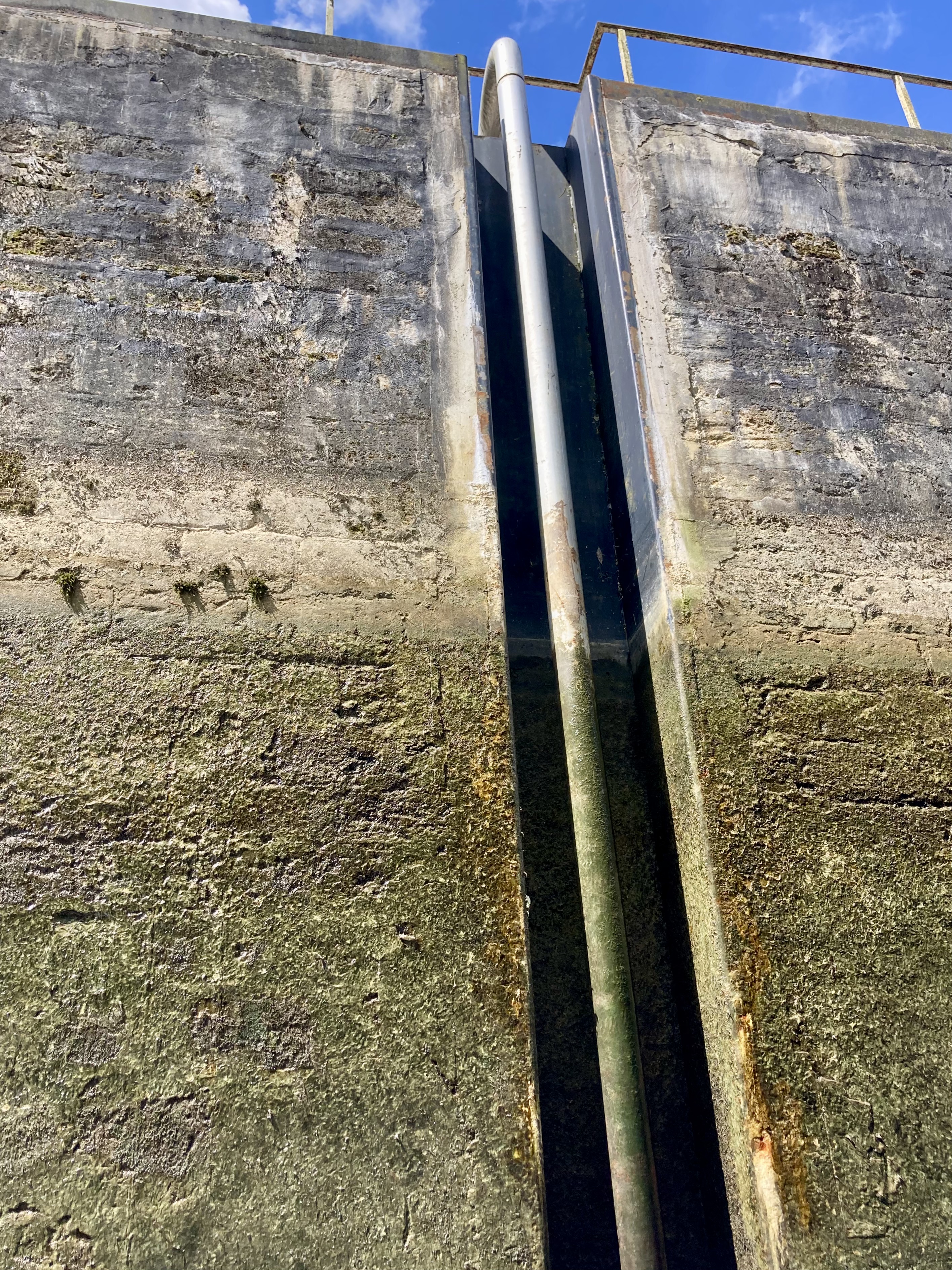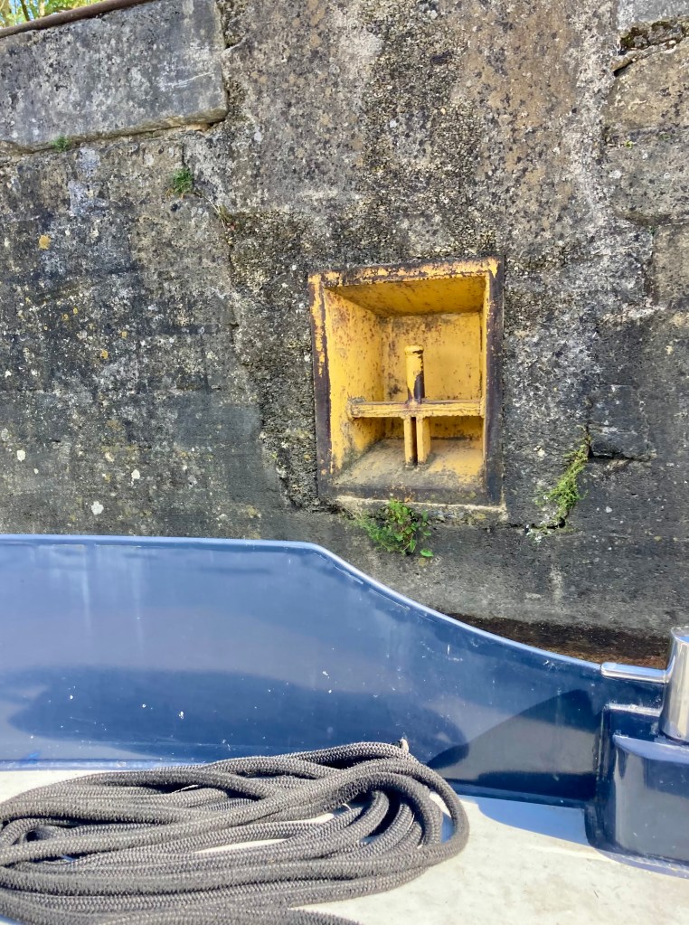 On the Canal Des Ardennes the locks had been 9m shorter and 0.6m narrower, so the first look at Dom-Le-Menil felt quite grand, although only just over 1m deep! The height of the walls in the lock and the bollards in the walls are reminders that the river can flow a lot deeper, although the flow is so well managed these days that it rarely happens.