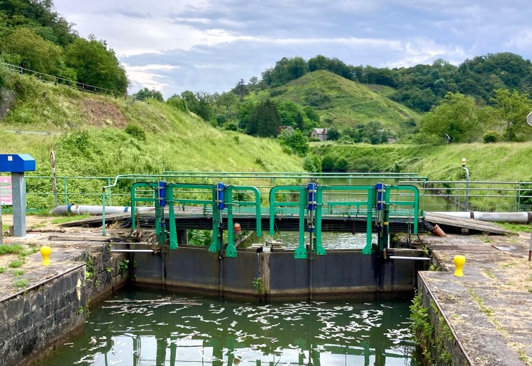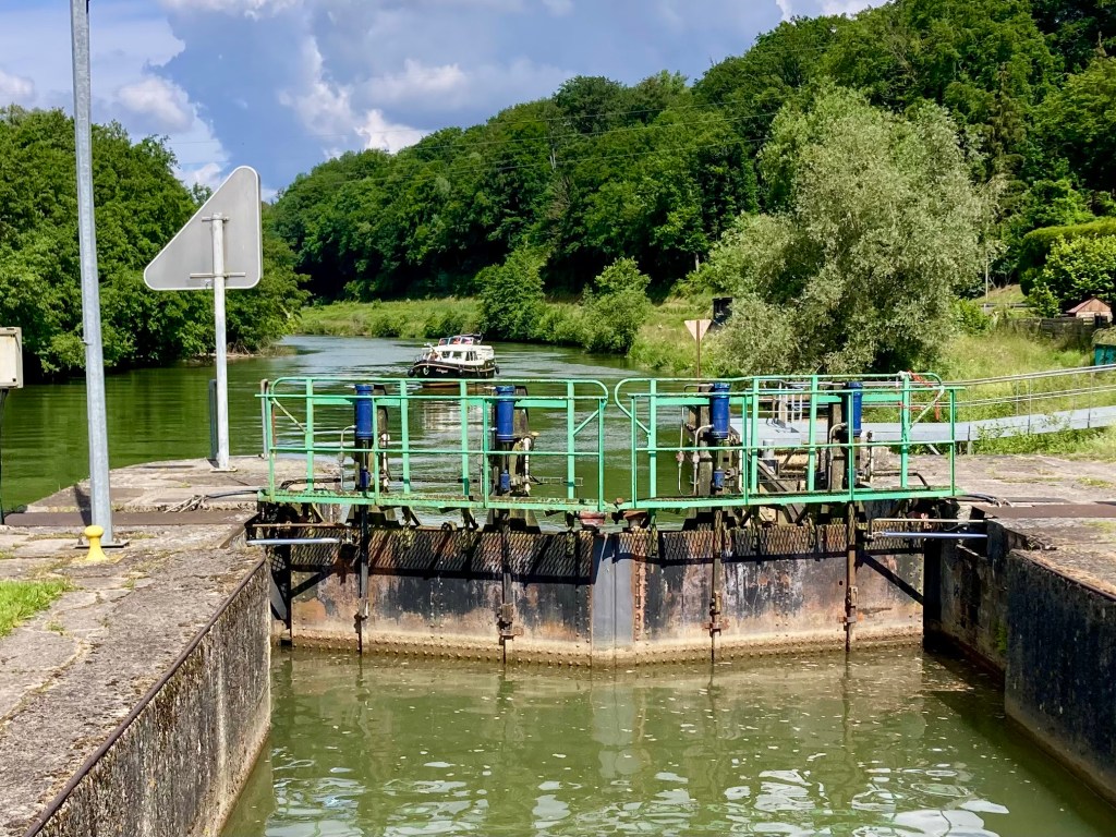 As we had not stopped at Revin we had a shorter cruise to the next night’s stop – just 16.5kms. The locks open at 0900 and we were so close we could wait until the lights came on, cast off, and by the time Captain Stu had turned Calliope round to face downstream again the lock gates were open.