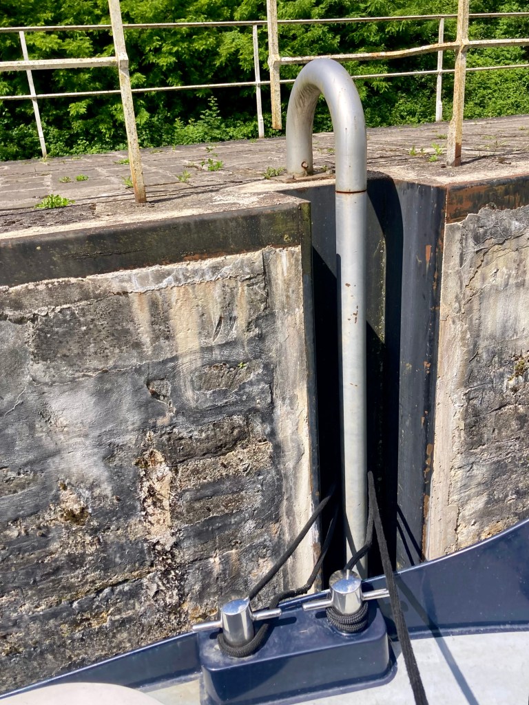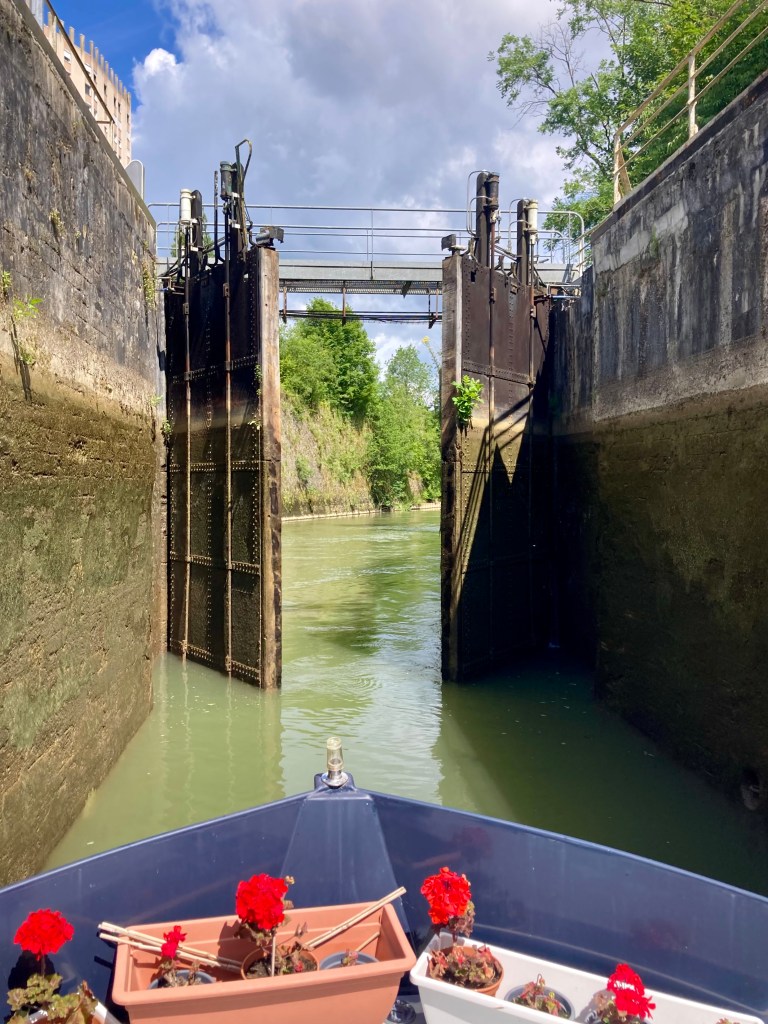 Our our last French lock for a while – les 4 Cheminées – was about twice as long and twice as wide as those we had been travelling through.