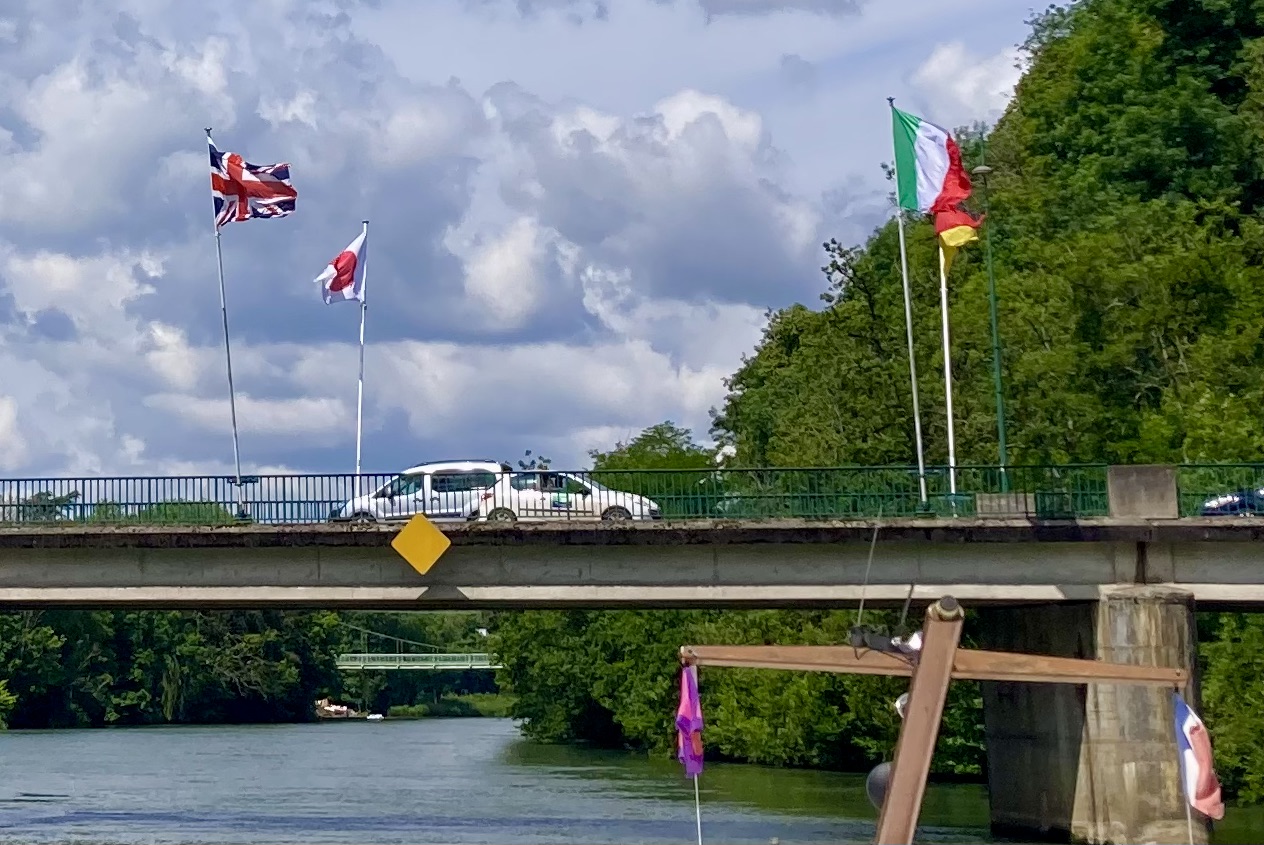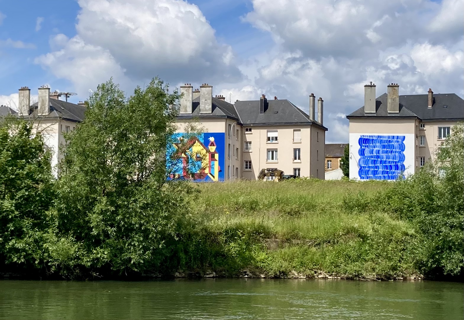 This lock is beside one of the old gates into Meziere, and not much before the bright welcoming street art adorning a line of houses, and the bridge into the port area, flying multi-national flags including the Union Jack. I think it must be in honour of the Olympics, due to take place in Paris in a few weeks time.