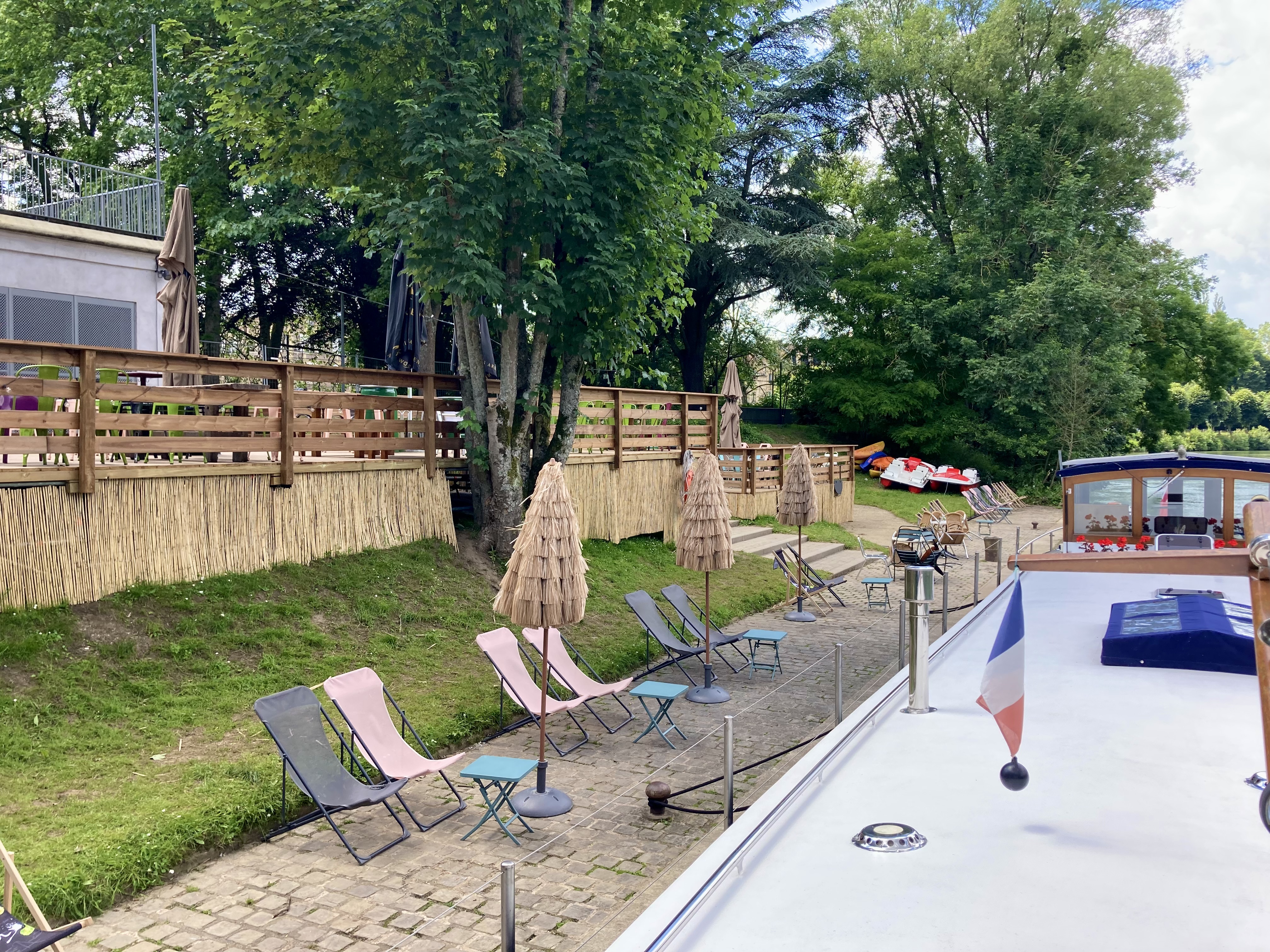 I show this second mooring as well in case you are ever looking to moor in Charleville. We are right at the back of a long pleasant shaded pontoon, with plentiful bornes for water and electricity. There is a well run camper van site almost alongside and the reception for the latter also acts as Capitainerie. It’s where you go to pay your mooring fee etc.