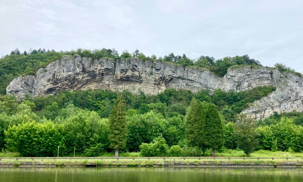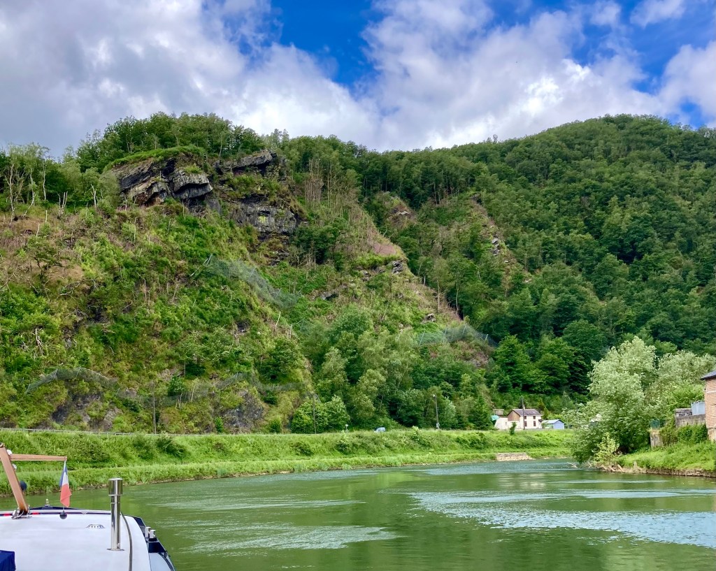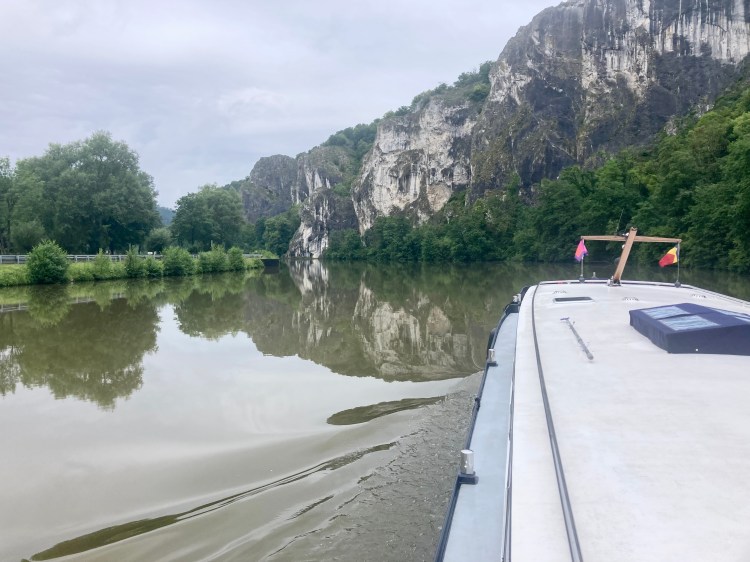 It was still grey and cloudy when we left Monthermé but the superb scenery of the Meuse valley made up for that. When you pass another boat you become even more aware of how small we are in comparison.