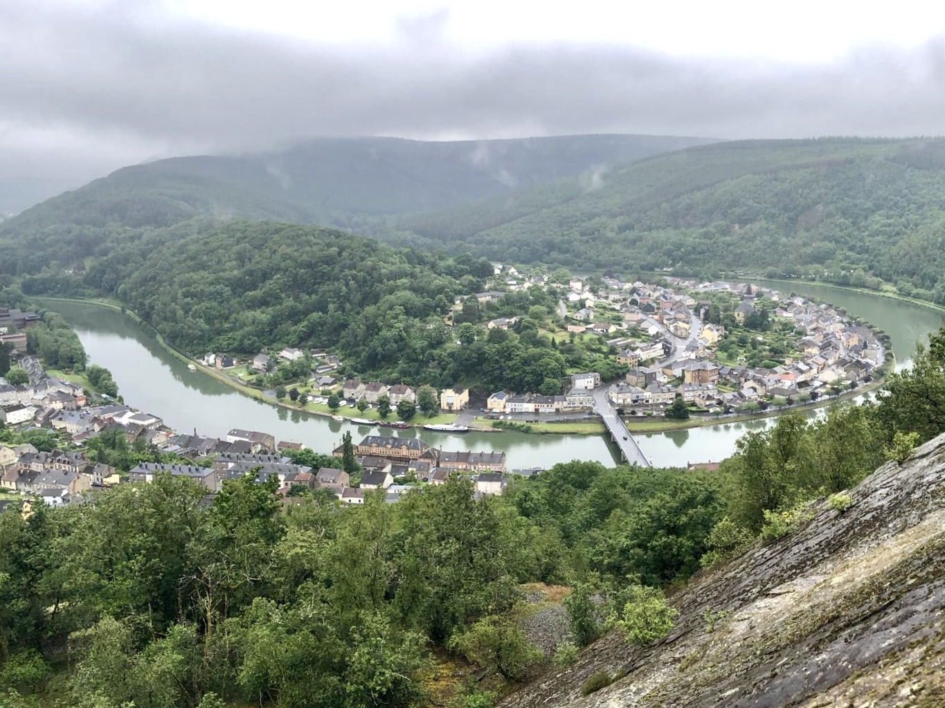 The river wound round the Roche de l’Uf and arrived at Fumay quay. The row of slate roofs is a reminder of the important industry that built Fumay up in the past.