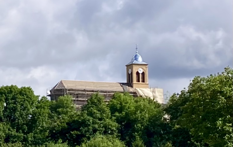 This is not the Leffe Abbey – it is not possible to get a good photo of it from the river. But the unusual shaped steeple on the main church, and the rows of colourful saxophones that decorate the streets and bridges, make up for it.