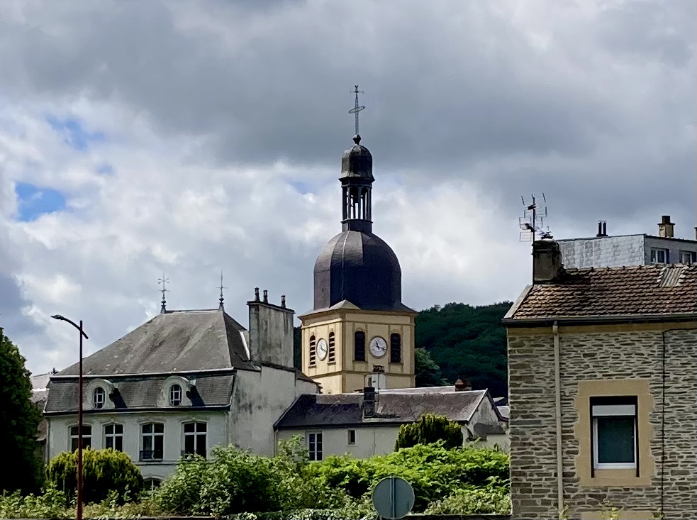 On the right is Laval-Dieu Abbey, founded in 867 by the Archbishop of Reims at the mouth of the Semoy river, where it flows into the Meuse. It is due to the growth of this abbey over centuries that the town of Monthermé came into being. It is open to visitors three afternoons a week in the summer, but not while we were there.