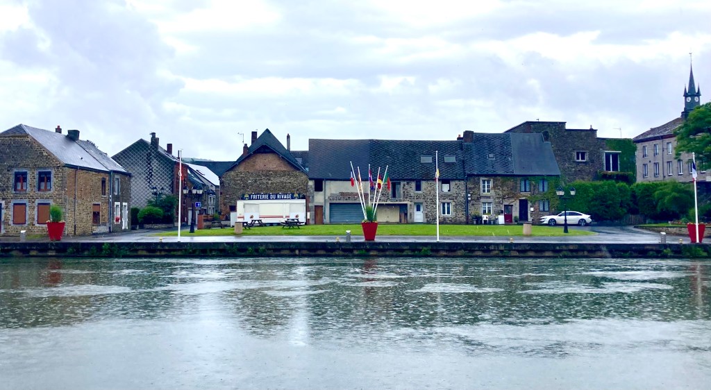 After this short delay we had just 8 kms to go for the day and would get there before lunch time. It was still raining when we arrived at Vireux-Wallerand, but the quay was completely empty … and the excellent Belgian style friterie van was still there – supper sorted!