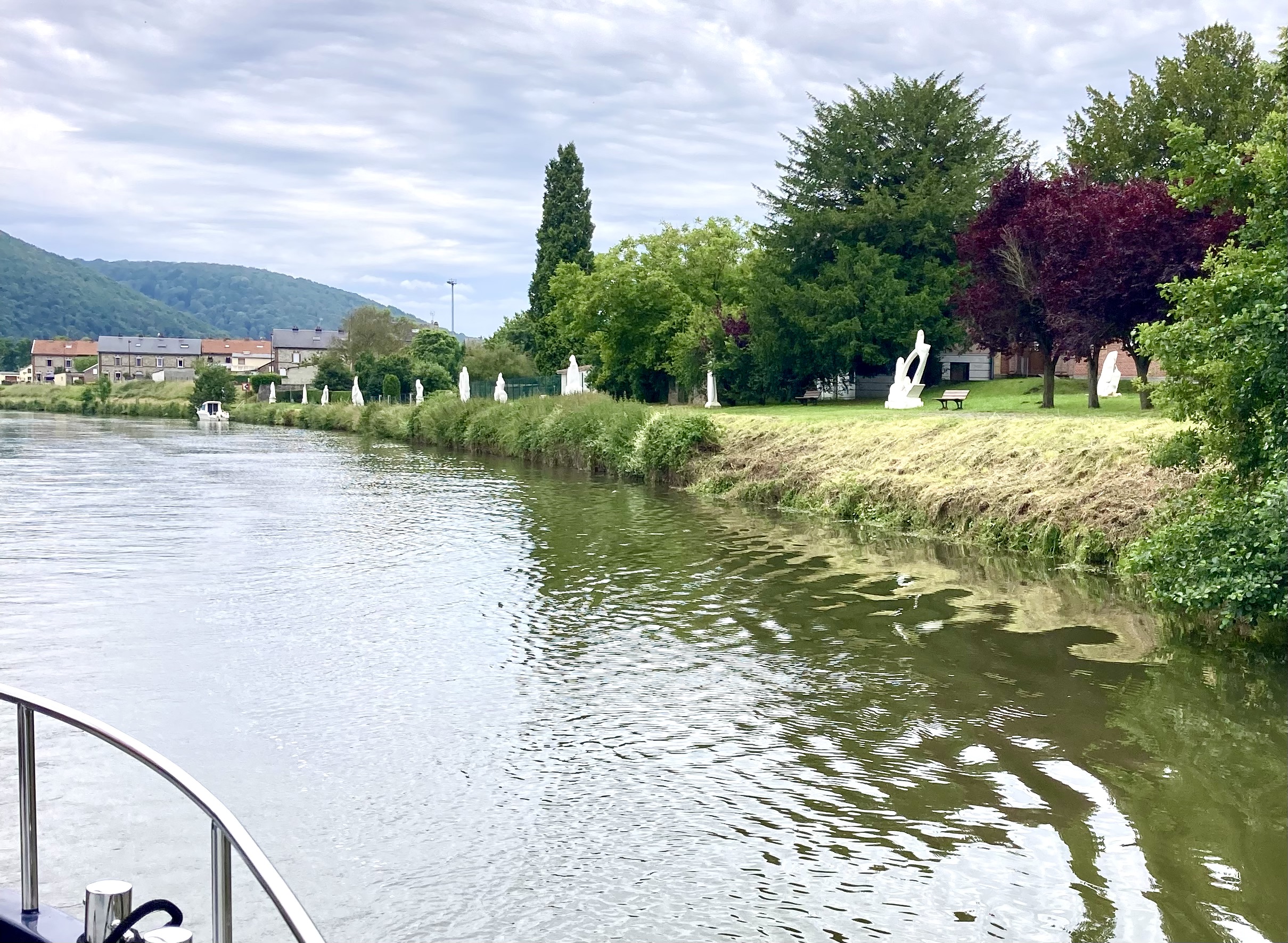 Before we reached Ham went past Aubrives – a village noted for its sculptor, George Favaudon. The riverbank is a perfect exhibition space for his work – not seen too well in the photo, but you can find out more about him and see this work close up at this link.