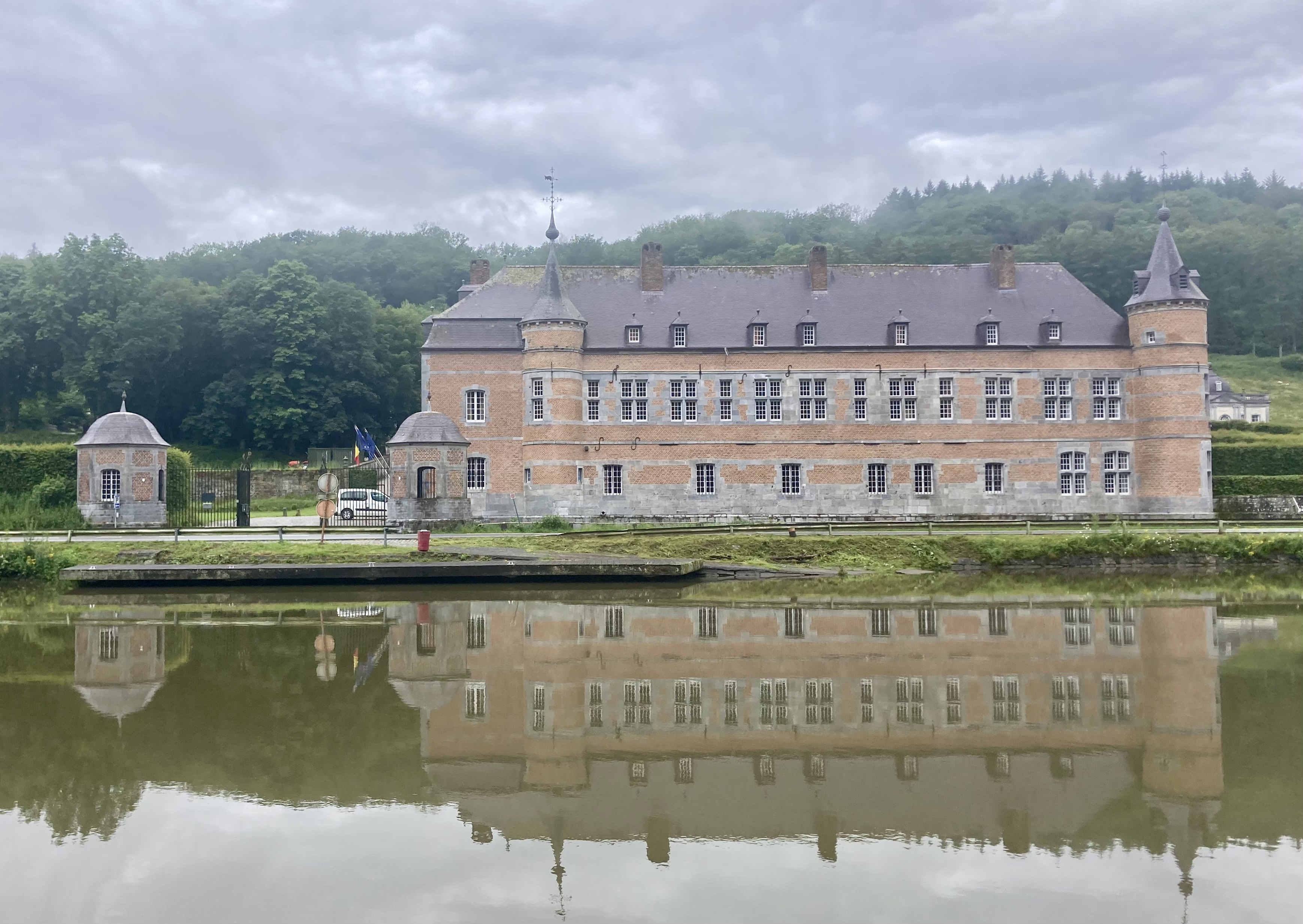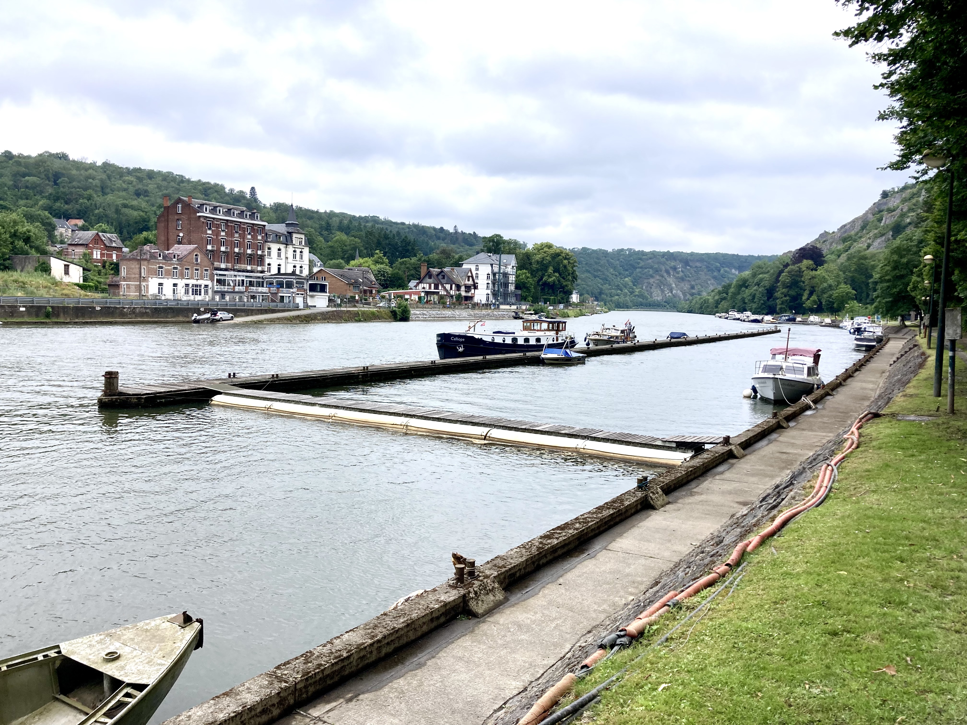 The moorings at Waulsort are interesting. Two long long pontoons, each about 100m long, are somehow anchored out in the river, allowing boats to moor both sides of each. It is a lovely place to be – truly midstream – so we stayed two nights!