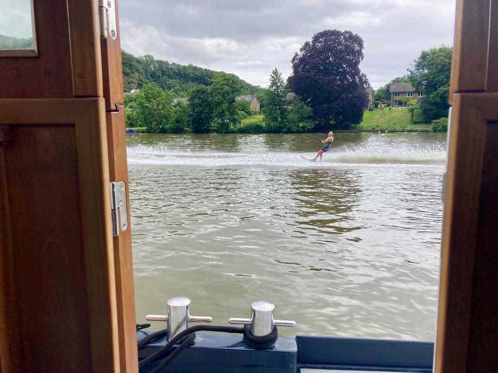 But the skies cleared again. Look at these photos of our evening, complete with water skiers passing by and a glass of wine on the back deck.!