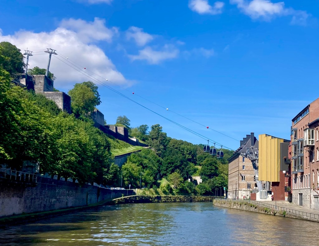 We had beautiful blue skies as we went under the bridges at the start of the Sambre in Namur, past the old Watergate with its Naurette tourist boat stop, and under the funicular that goes up to the Citadell. The walk up there is interesting, but not for the faint hearted, though we have done it in the past.