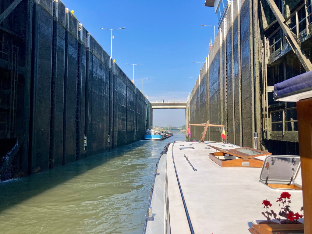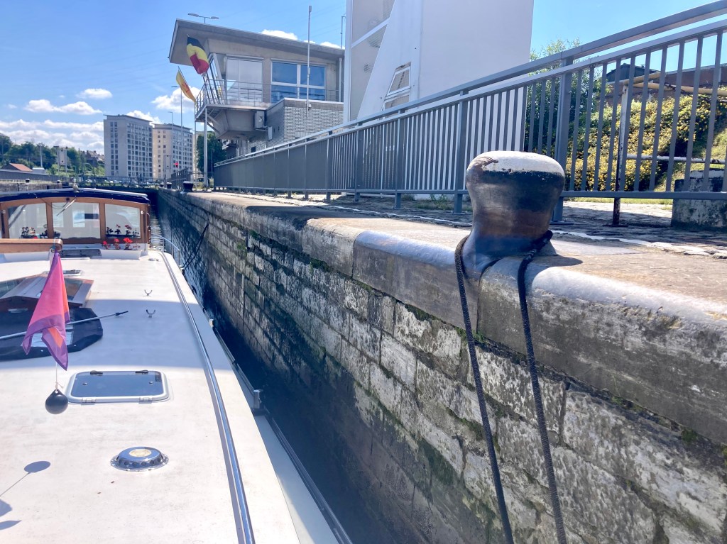 For Calliope, and also the cruiser we had now paired up with, it was another 5m down through Lock 2 with its ‘bollards in the wall’ method. Then onto the Scheldt, a big and busy river that goes on until it reaches the sea at Antwerp.