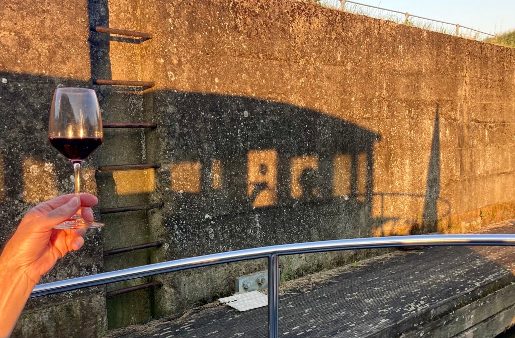 Later, after an easier walk downhill from the abbey and village, and back with Calliope, we were able to enjoy rosé wine in the evening sun. Chilled rosé wine tastes so much better out of doors on a warm sunny evening!
