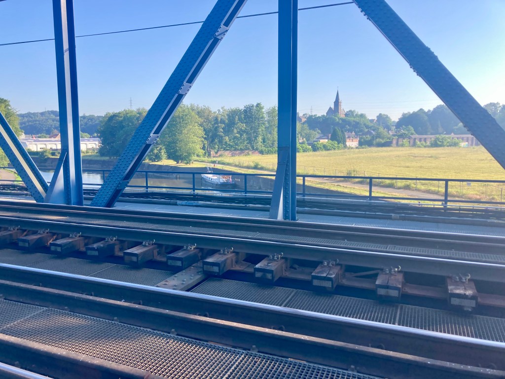In the morning, I did a quick scurry across the railway bridge and into town to get some bread before we left Auvelais behind.