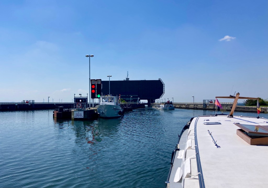 Forty minutes later and we are on our way into the lift basin, following a commercial barge and our new friend, the Tjalk, coming in behind.
