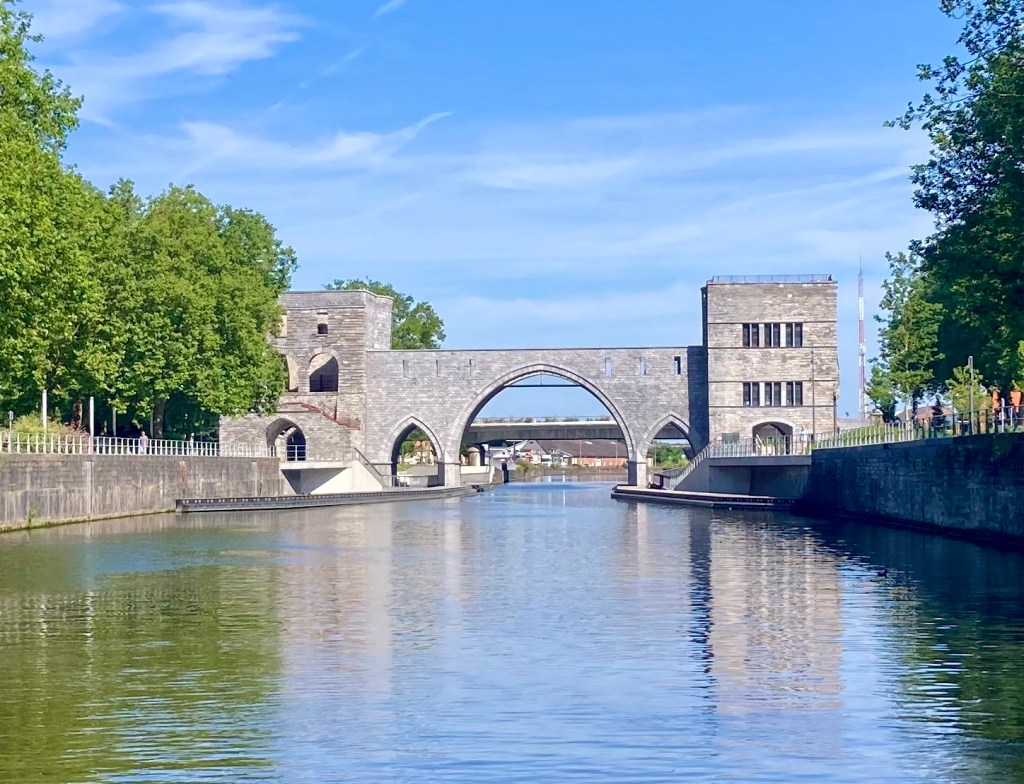 Over the past few years a massive amount of work has been down on Tournai’s medieval bridge, Pont des Trous. The central arch has been widened and heightened to allow the passage of modern commercial barges.