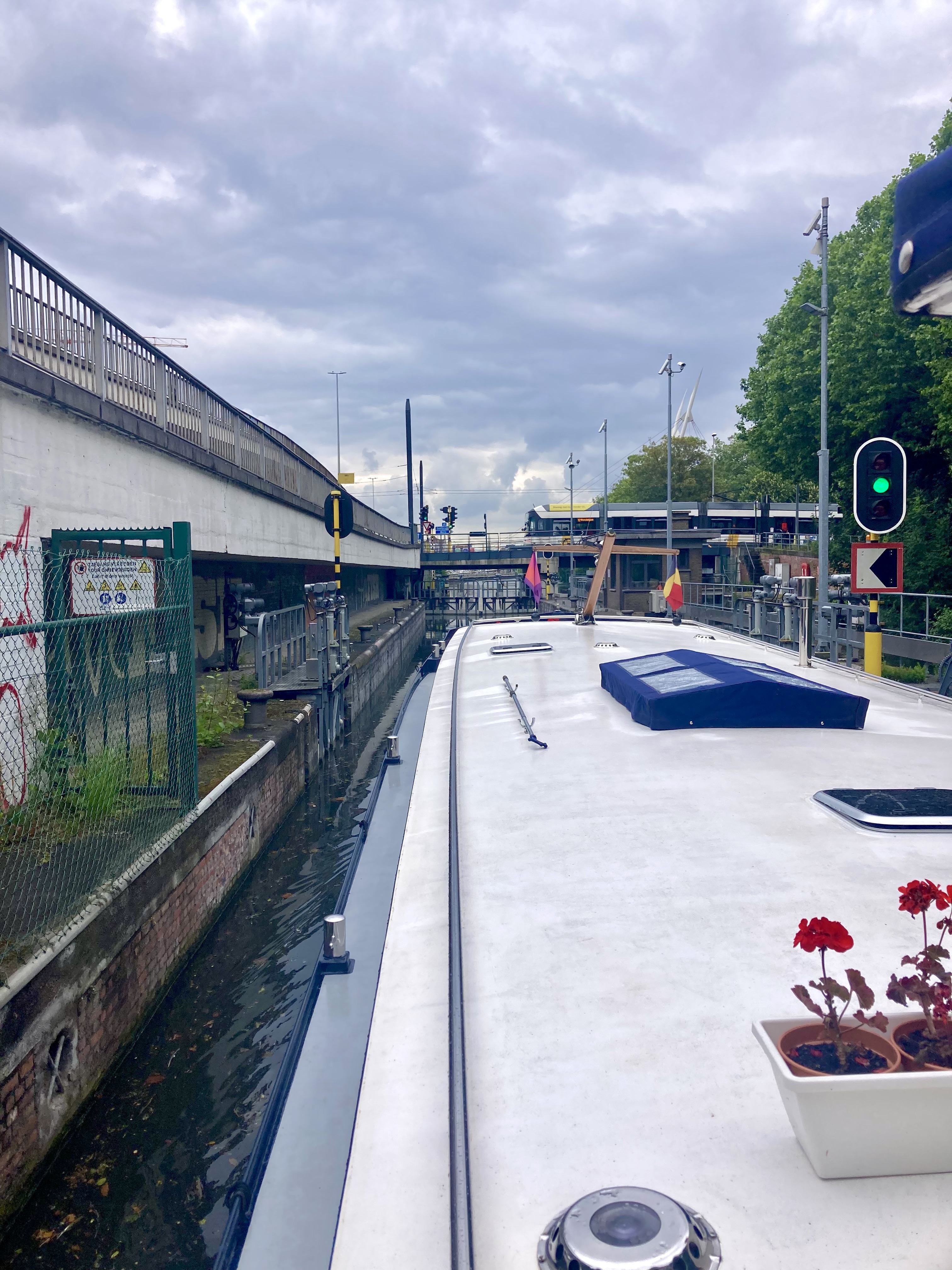 We came to a red light on the outskirts, and realised we would need to wait for a boat or two to come through from the opposite direction.