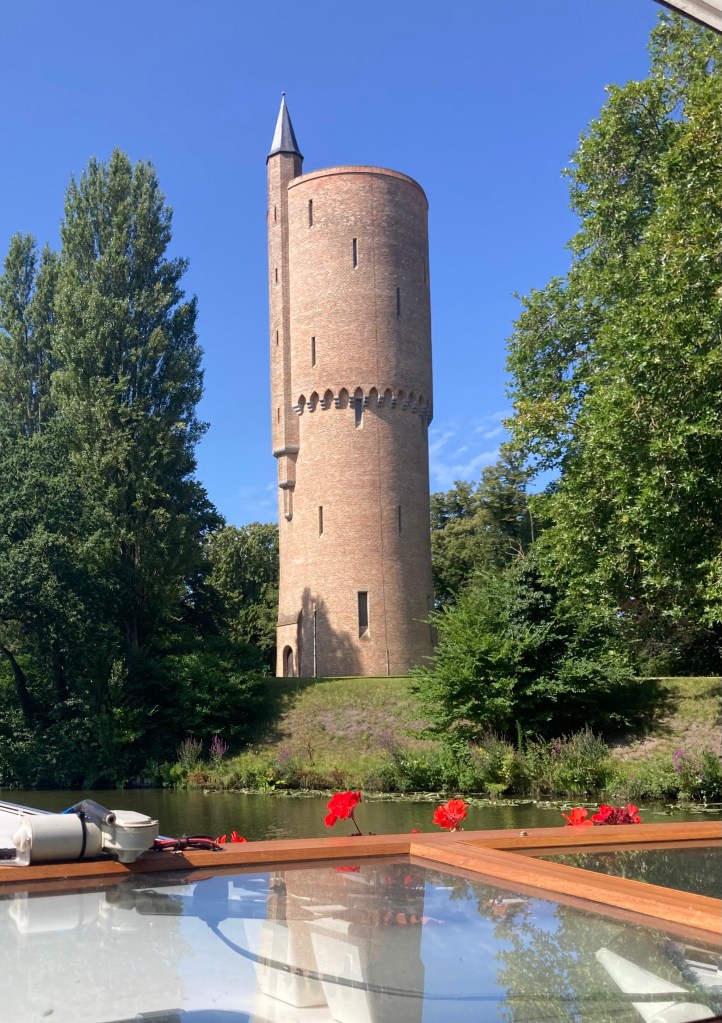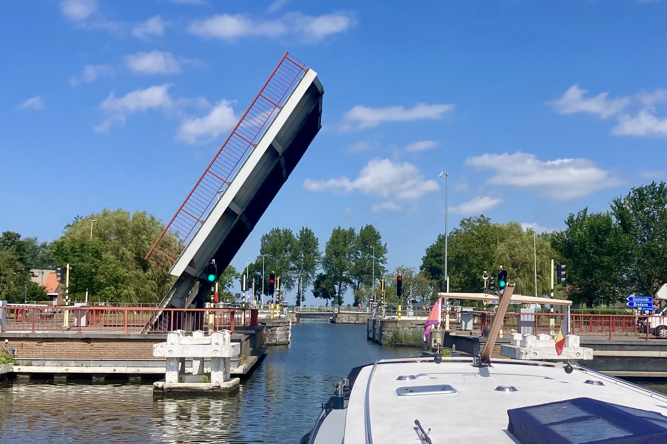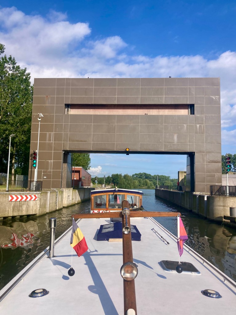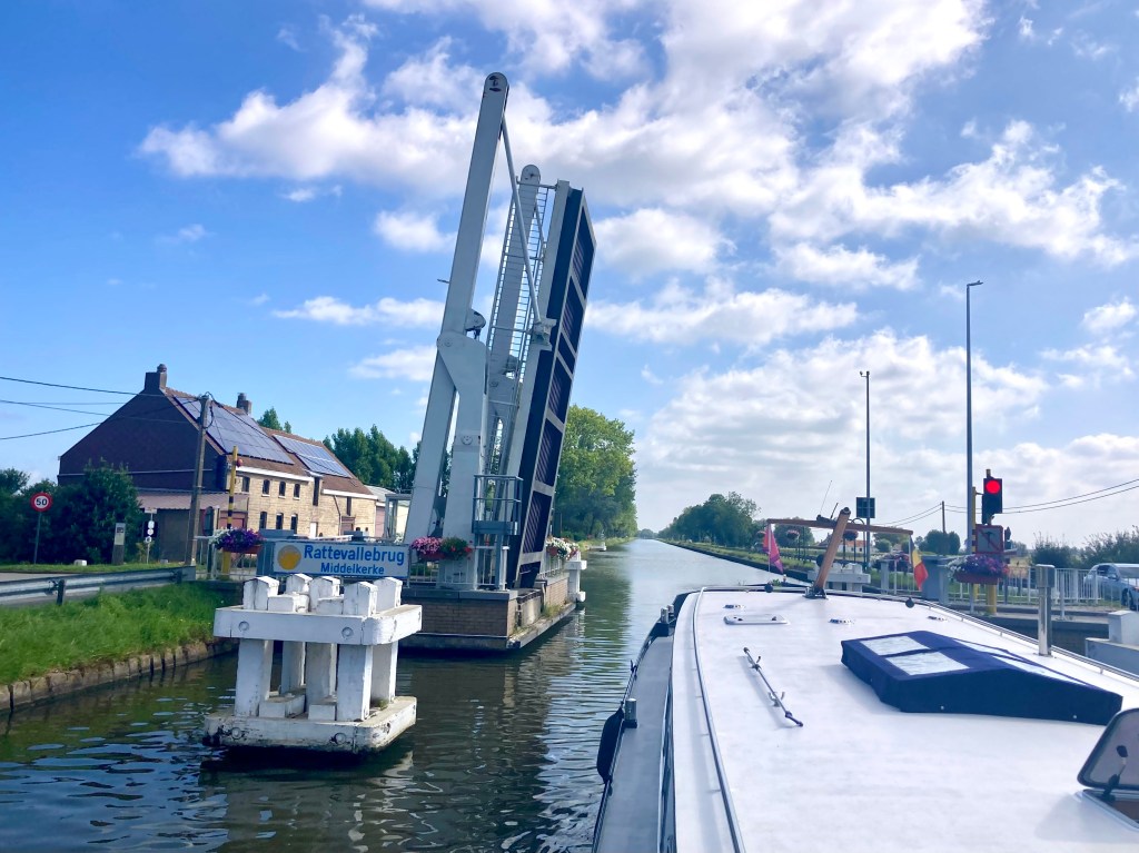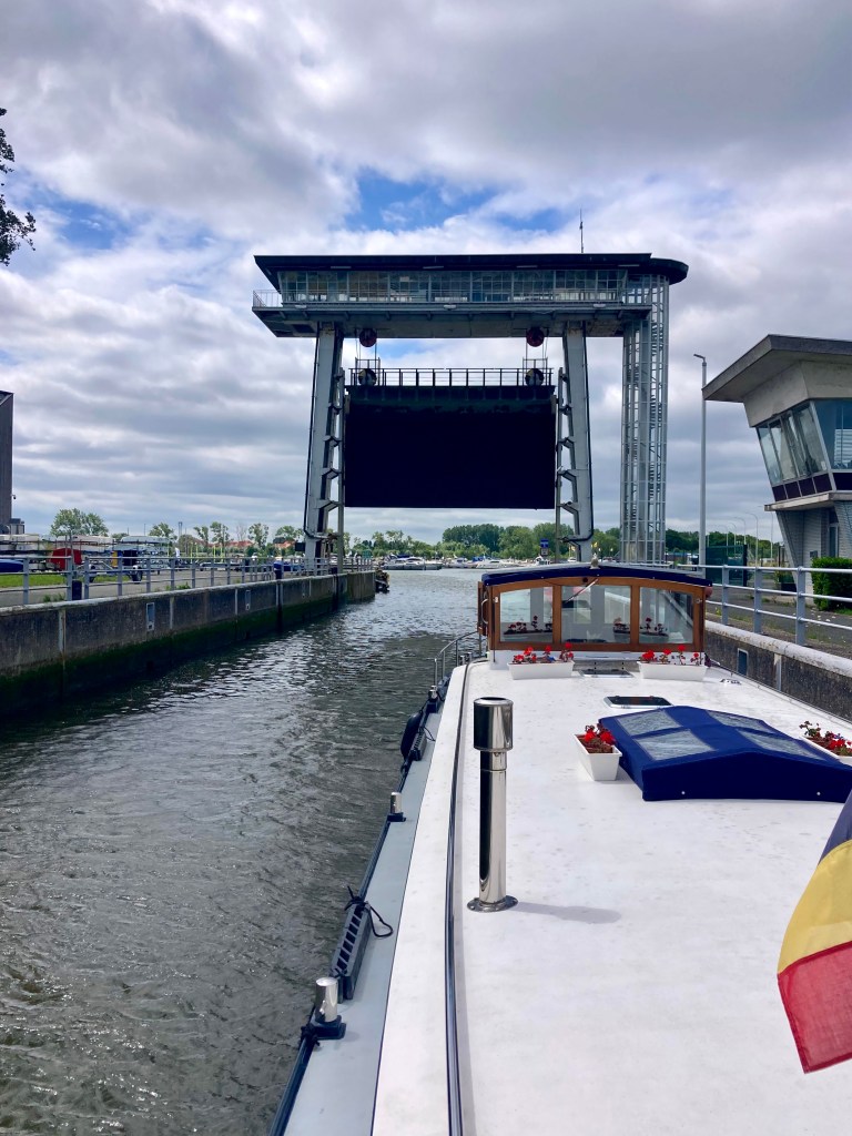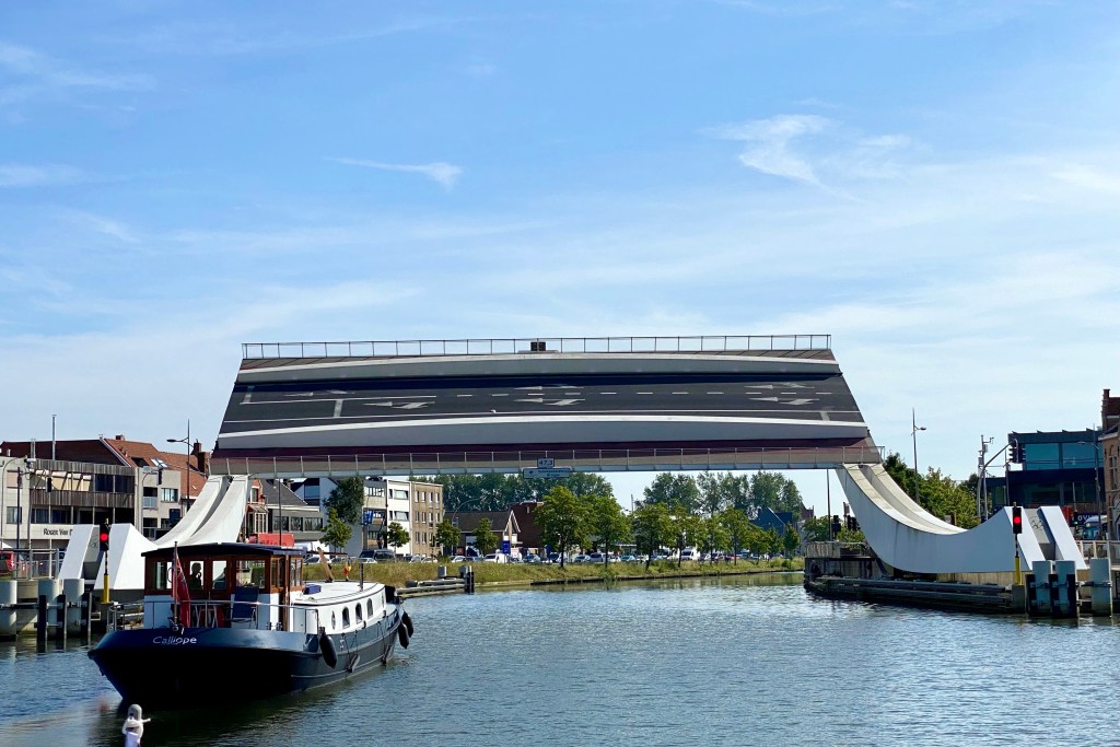 This time Isabelle took a photo of us going under my favourite modern bridge. It is at Brugge and fascinates me every time with its ‘rotation’. The road rotates skyward, becoming almost vertical; the road traffic stops and the water traffic passes beneath.