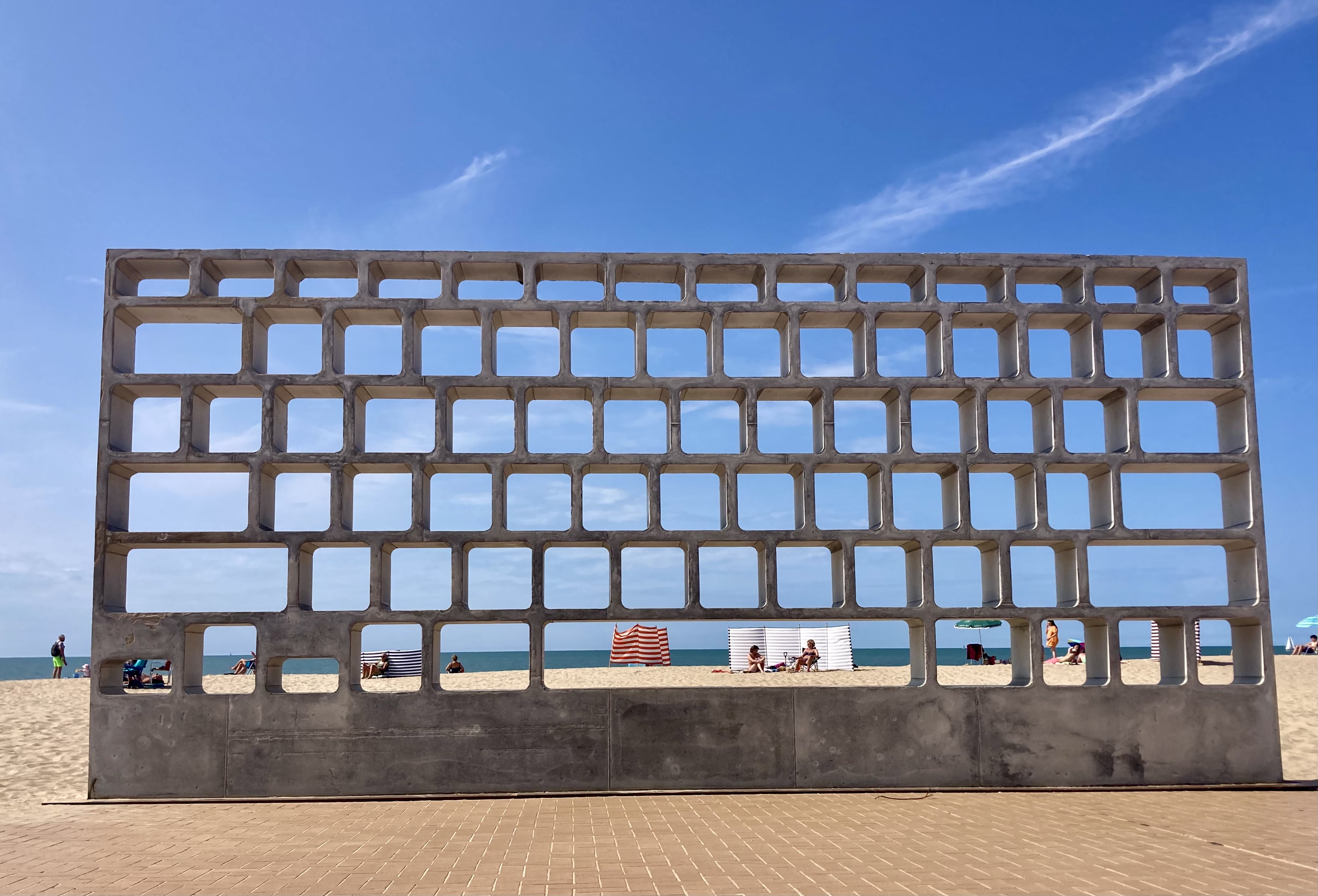 It was a beautiful day – in fact the whole two weeks had blue skies and warm, sometimes hot, sunshine. The beach is clean sand and the North Sea was warm! We also caught up with a couple of the art installations that were part of the Beaufort Triennial . The one showing here is a giant keyboard, with the buttons missing.