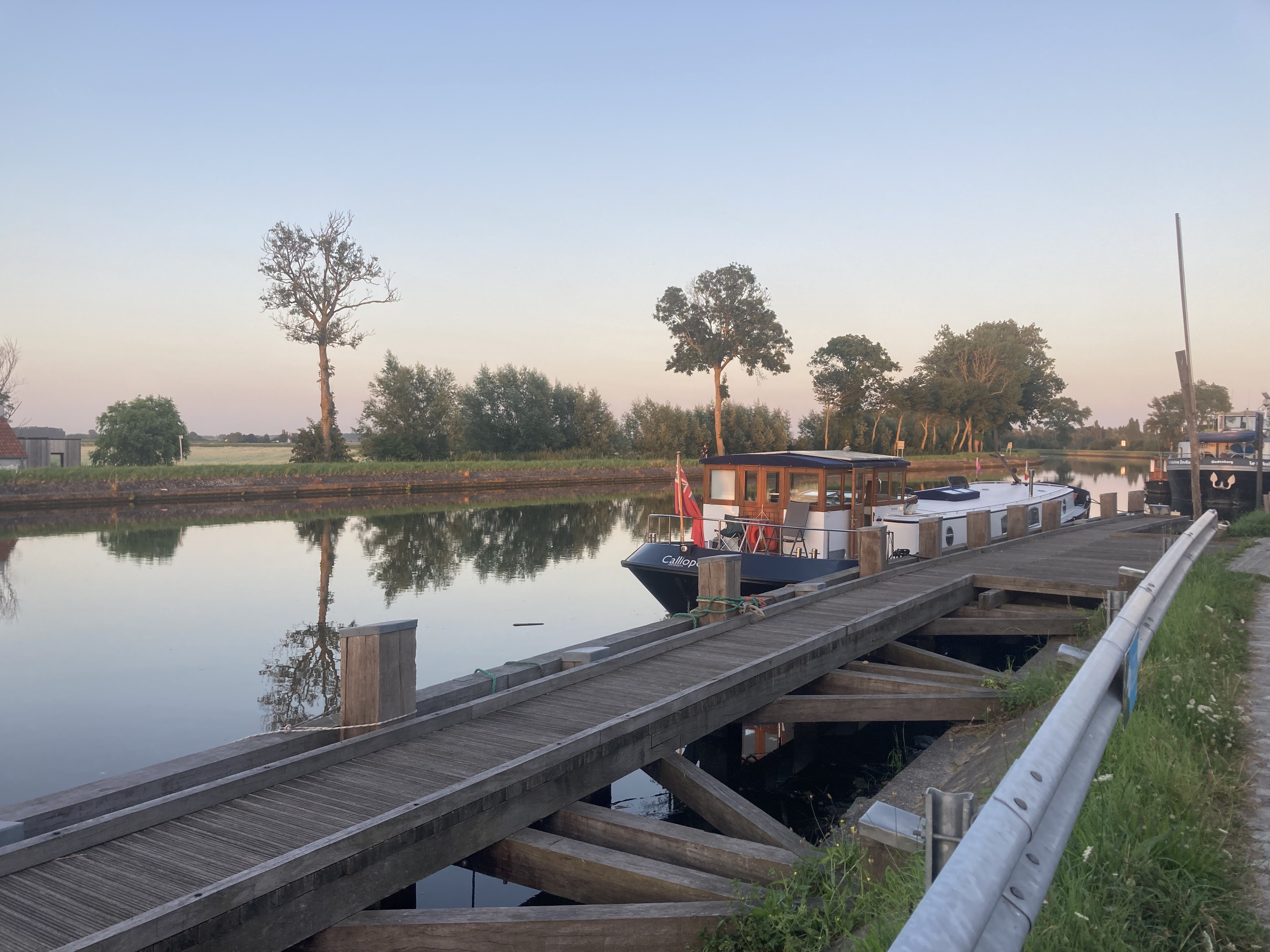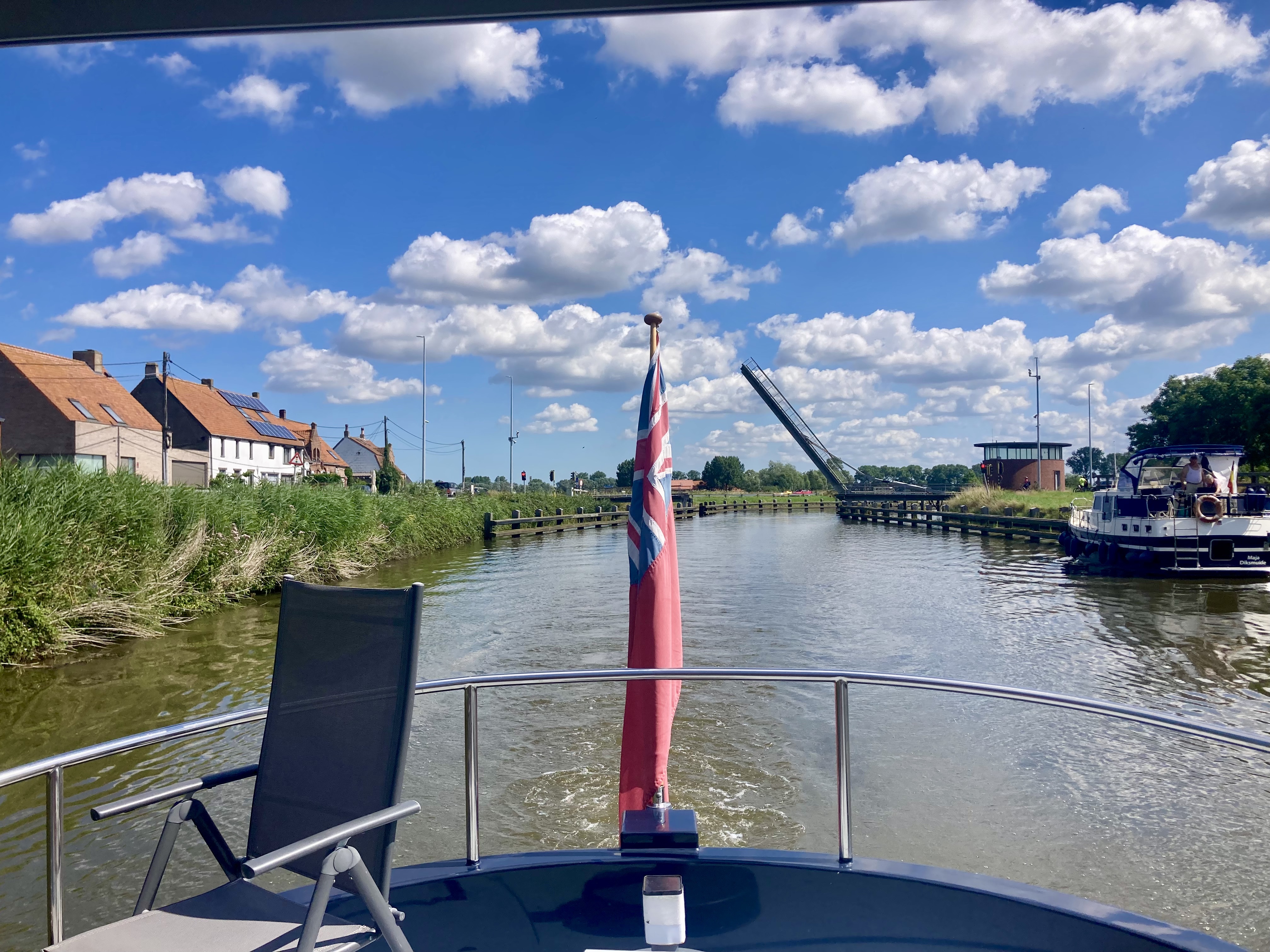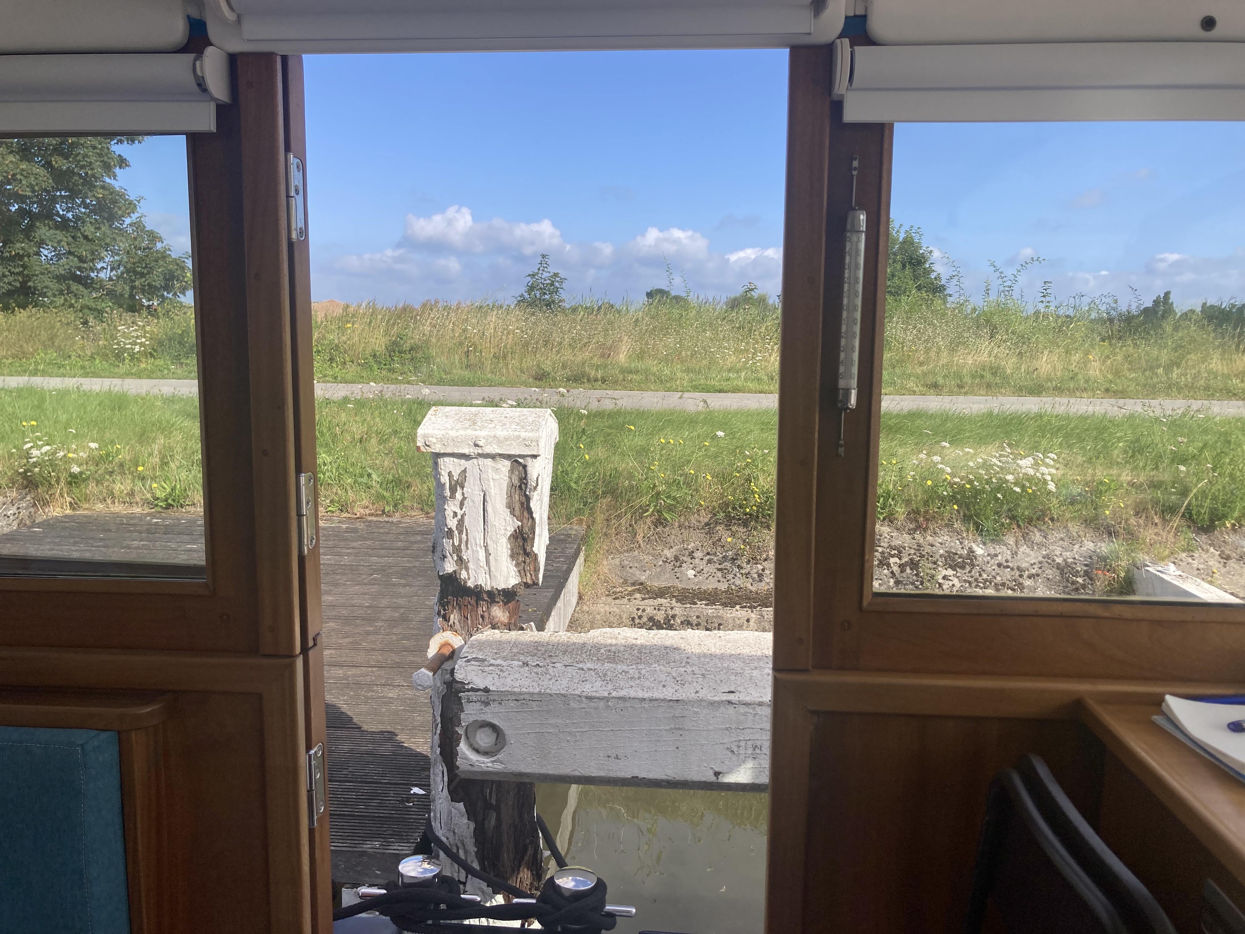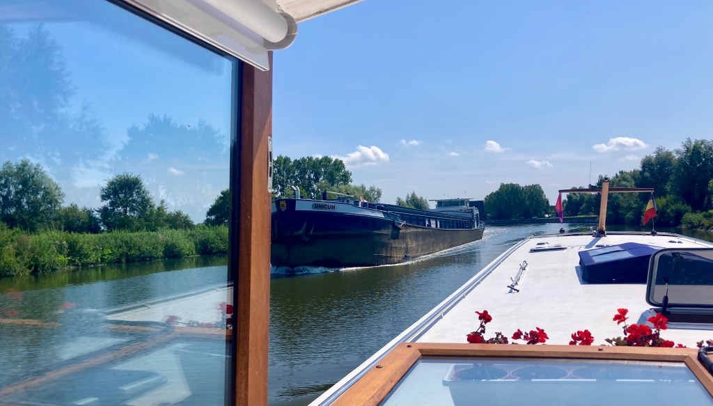 After that we were on our way, leaving Brugge in our wake and heading for a rural mooring we had spotted a few weeks earlier when going the other way. The sky was blue, the windscreen down, and both countryside and commercial traffic passing by.