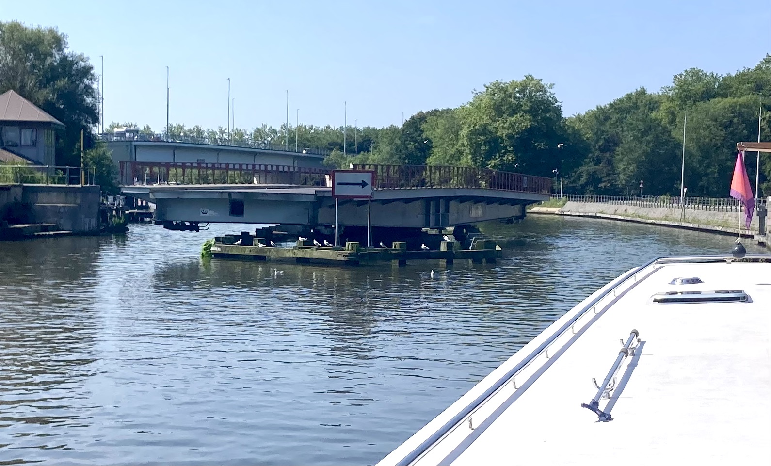 It was extra small and unusual this time! As the bridge in front of the lock lifted we could see that the lock gates at both ends were open! There was no difference in depth between the two canals and we drove straight through.
