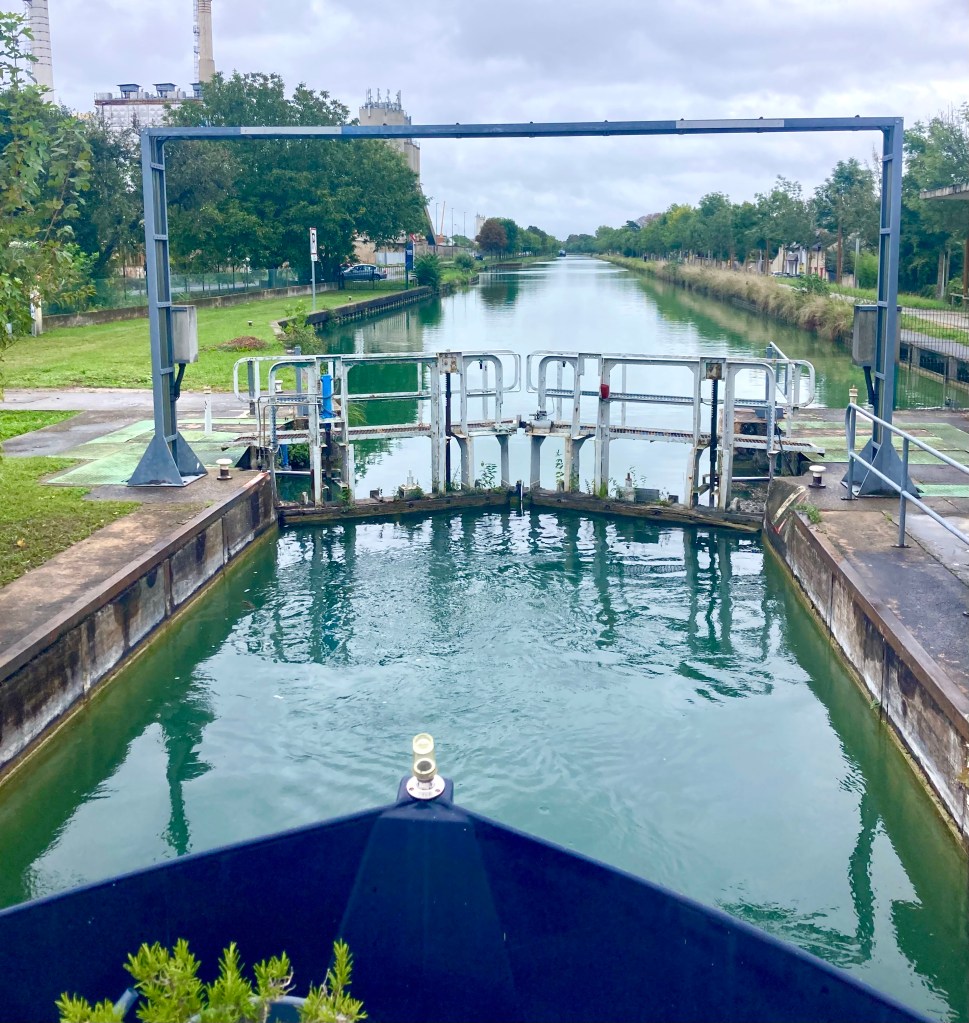 A kilometre and a half further through the city and we arrived at our first lock of the trip. There are three close together in Reims – Fléchambault, Chateau d’eau and Huon. All are less than 3m deep so we were through them quite quickly.