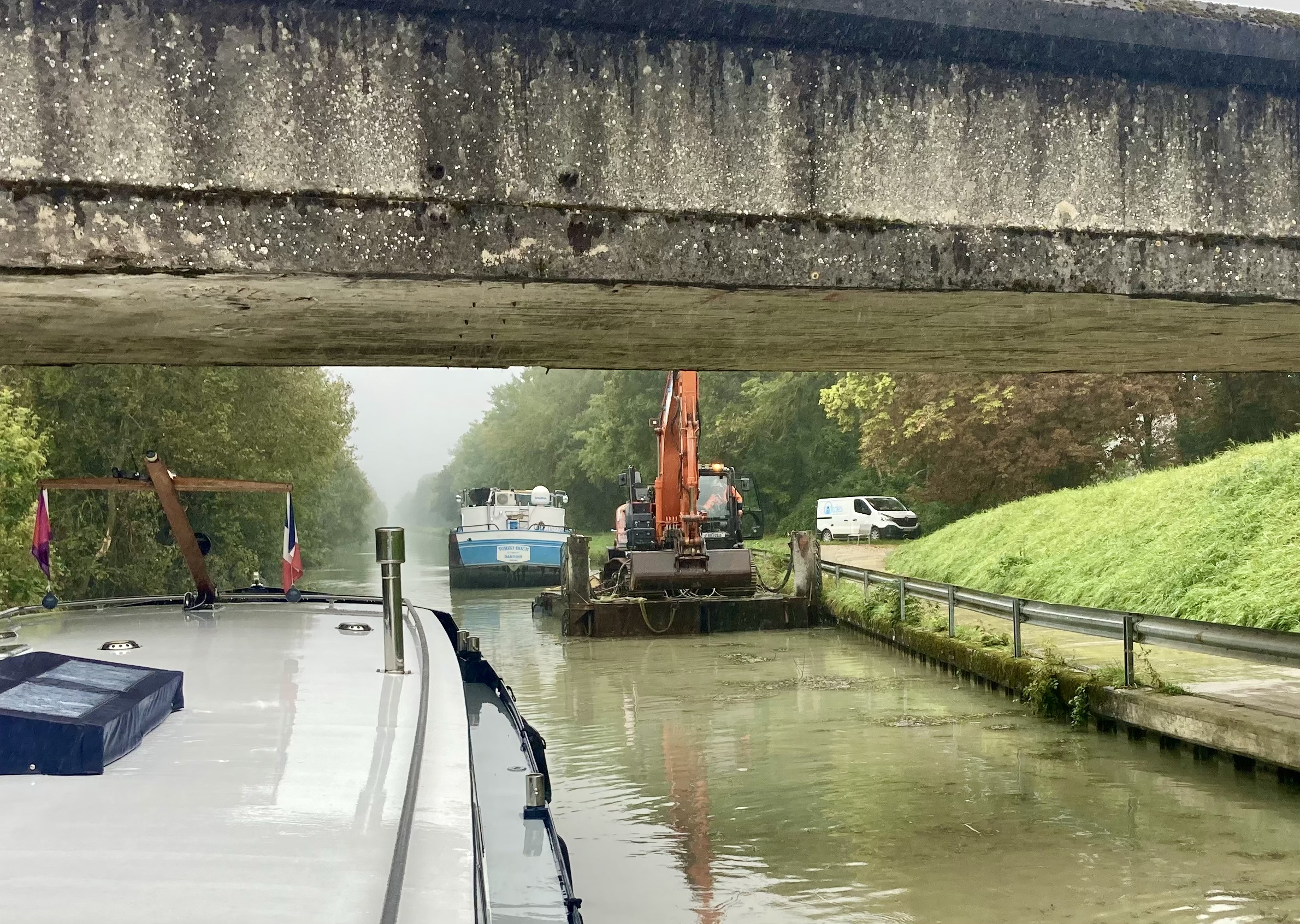 As we got closer we could see than it was two craft – one dredging at the edge of the canal and the-other being loaded up with the resulting sloppy mud. I remembered that I had read an Avis (notice) from then VNF informing all boats in the area about the dredging operation.