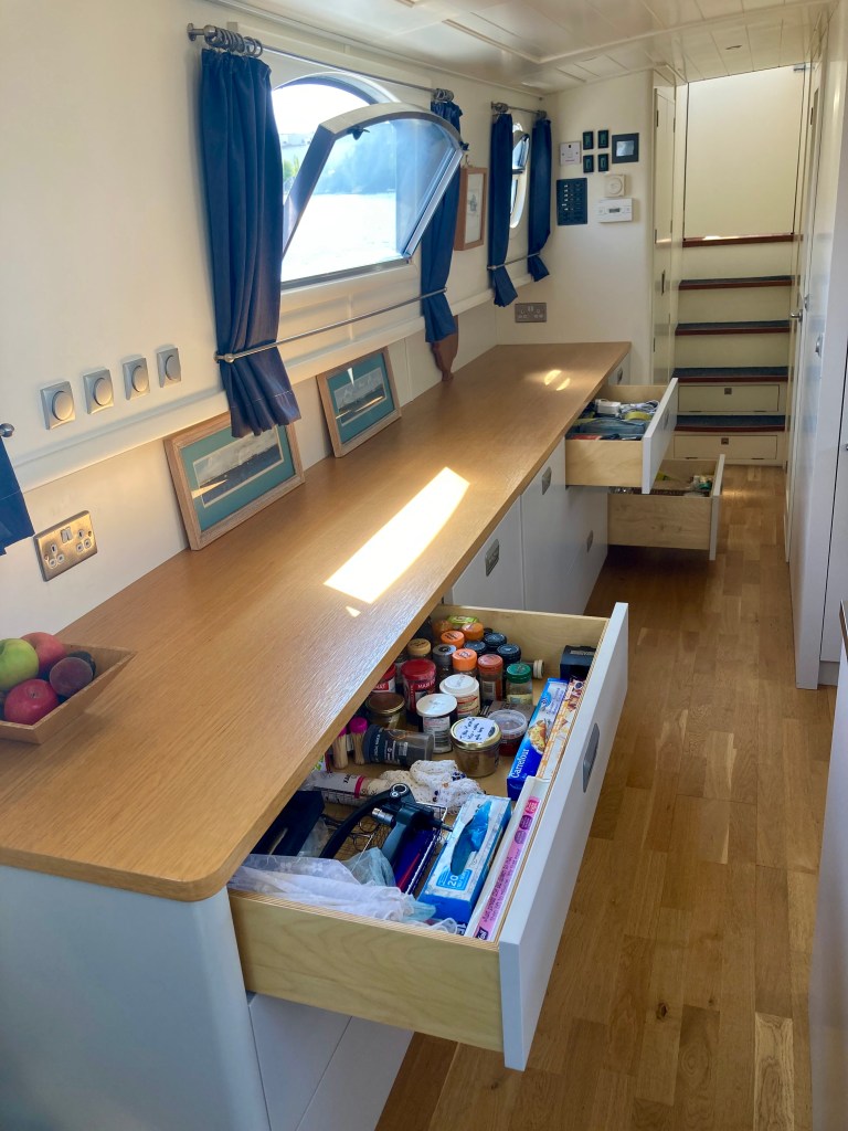 Down below Calliope’s 3 large windows each side and dog box above ensure that below decks is light and airy for the living areas – the engine room and technical data follow. If that is more your interest just scroll down.