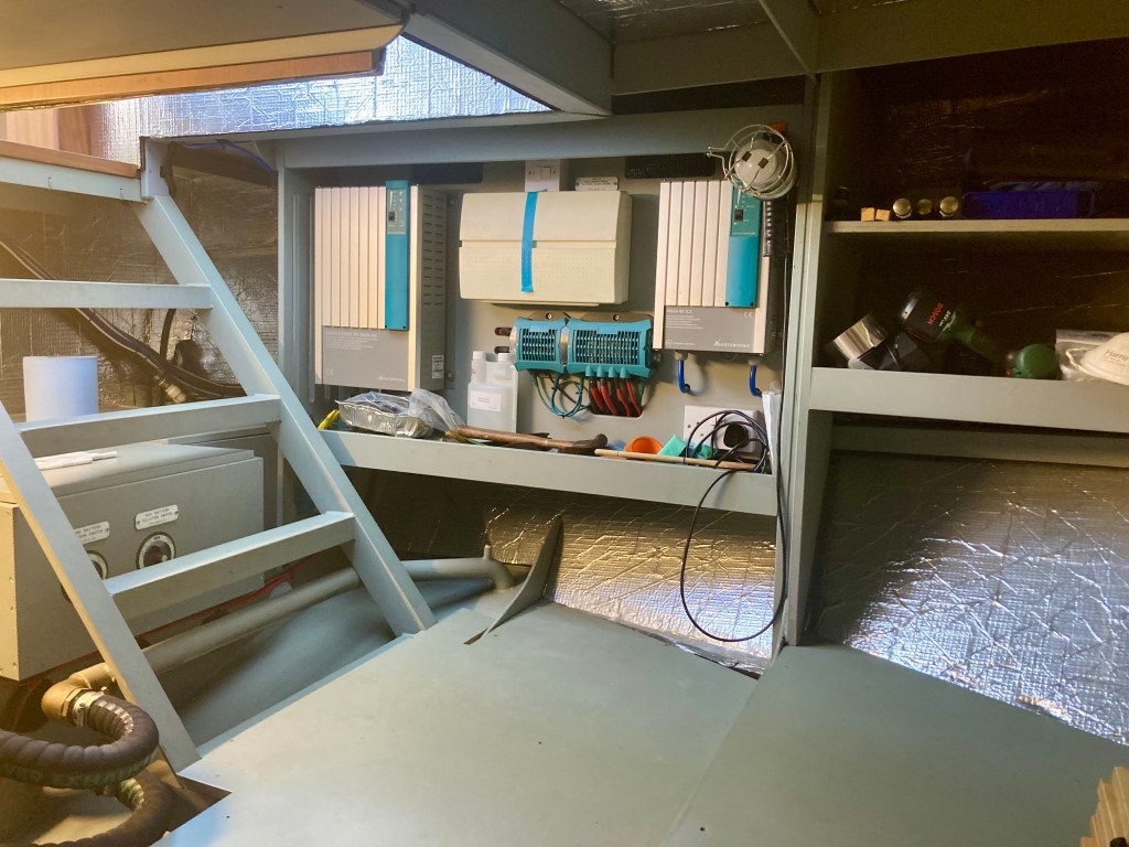 In addition to the 150hp BetaMarine engine it houses the Bubble PJ diesel powered boiler, hot water tank, DAB Easybox pump for domestic water (new 2024) and the pumps for black and grey water waste.