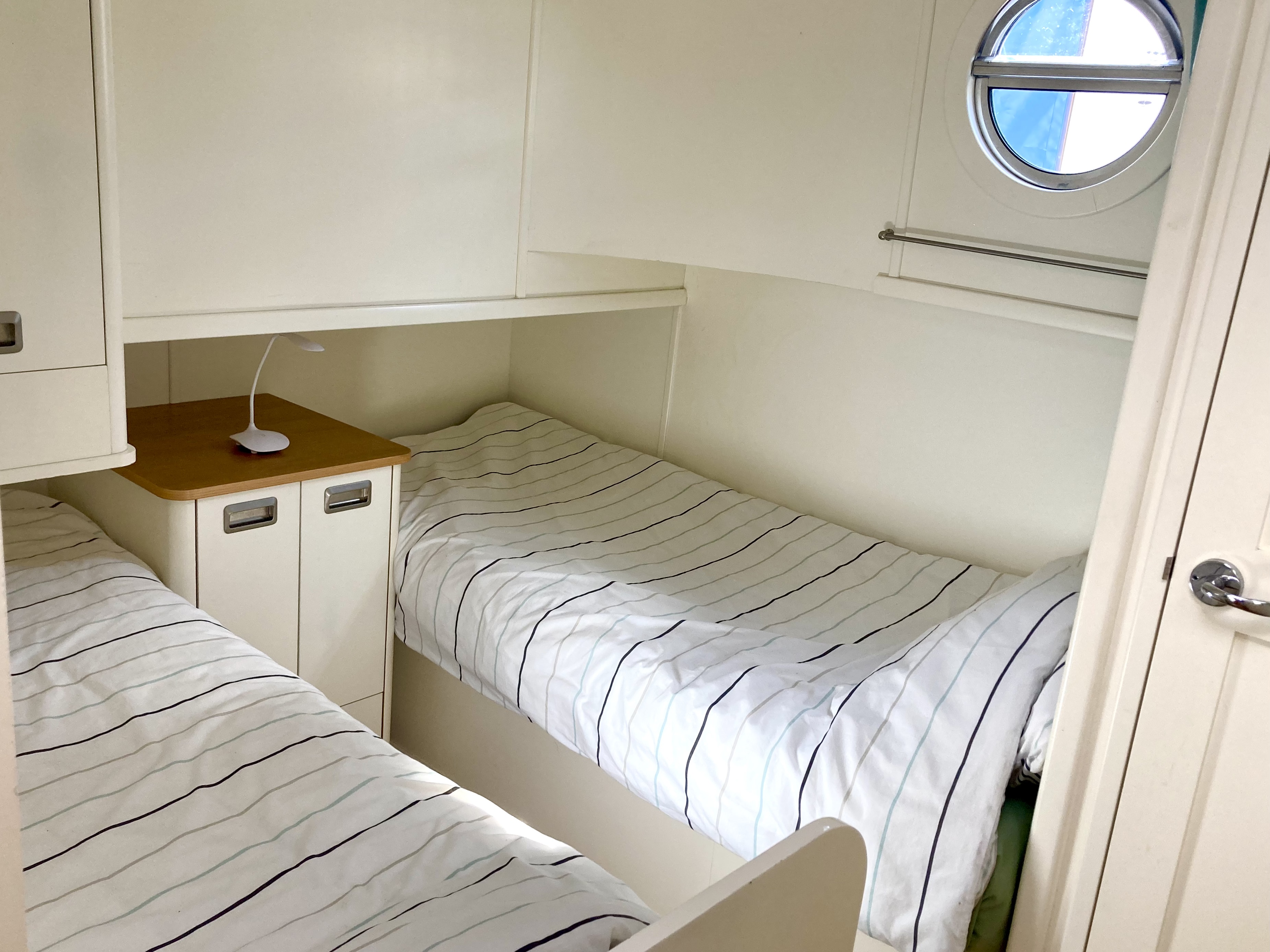Cabin 2 is towards the stern and ideal for friends or family with its comfortable, long, twin bunks and its own ensuite with shower.