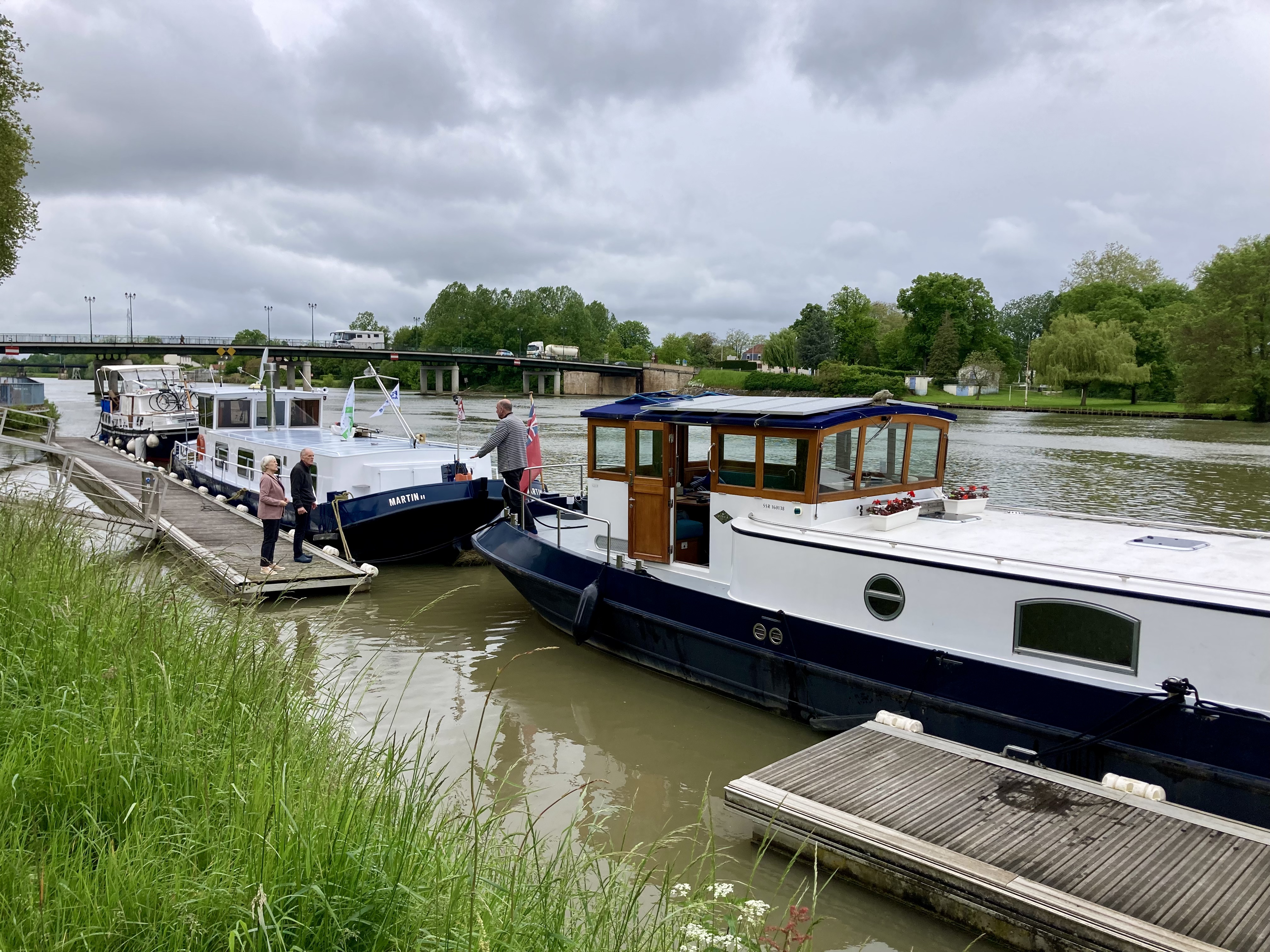 Then we settled into a nice afternoon and evening on our special mooring, right next to the passerelle (footbridge) across the river, so had plenty of people looking in!