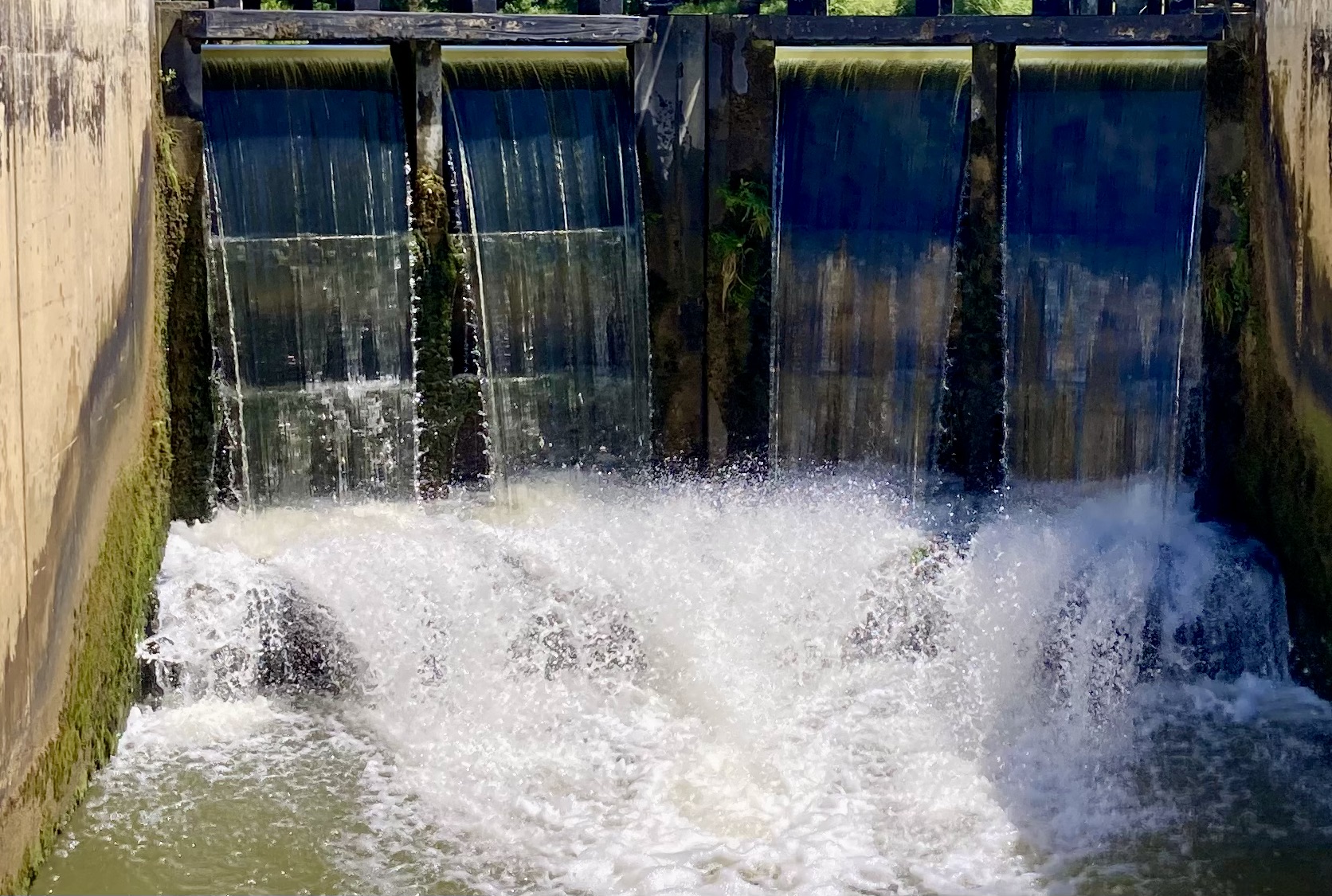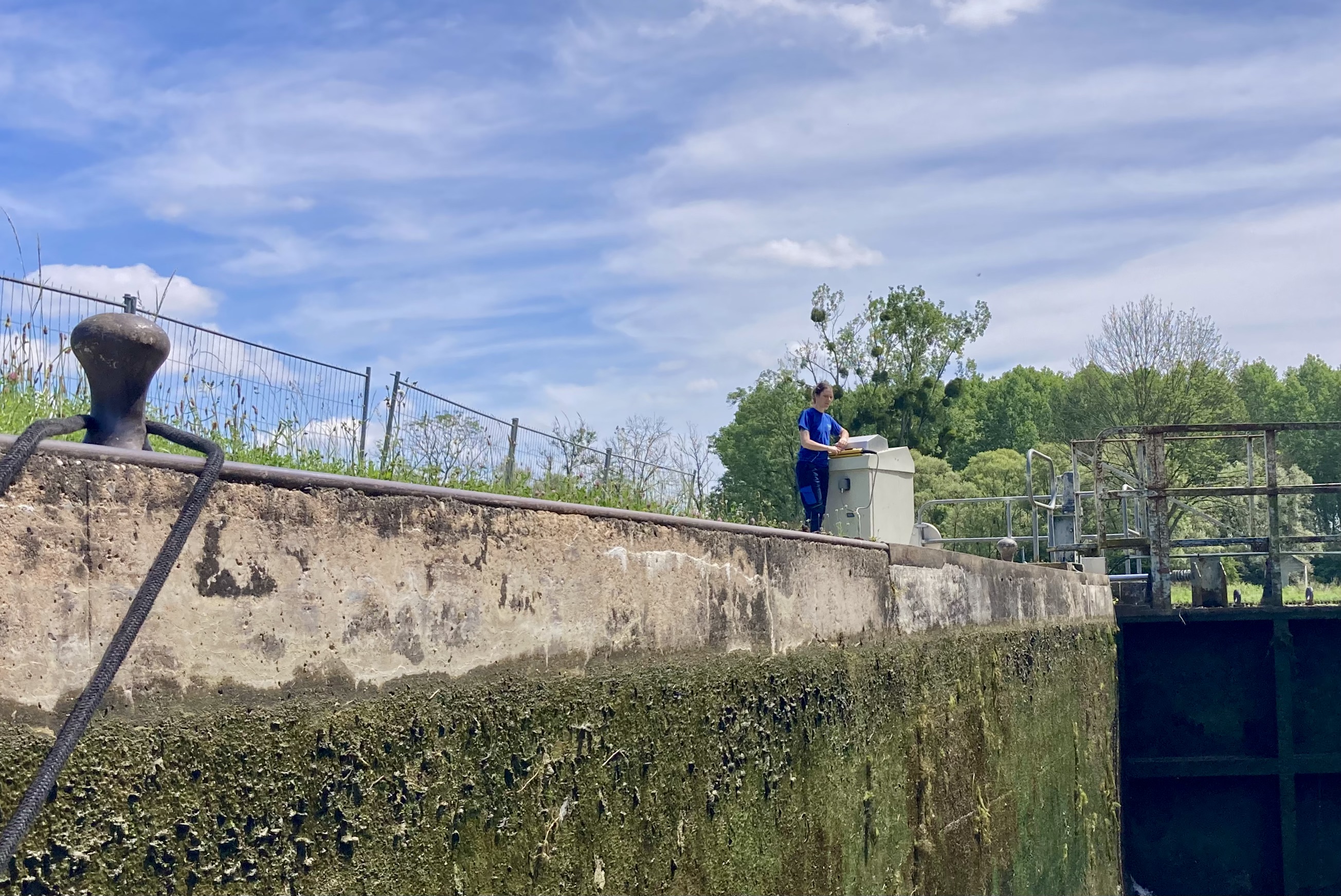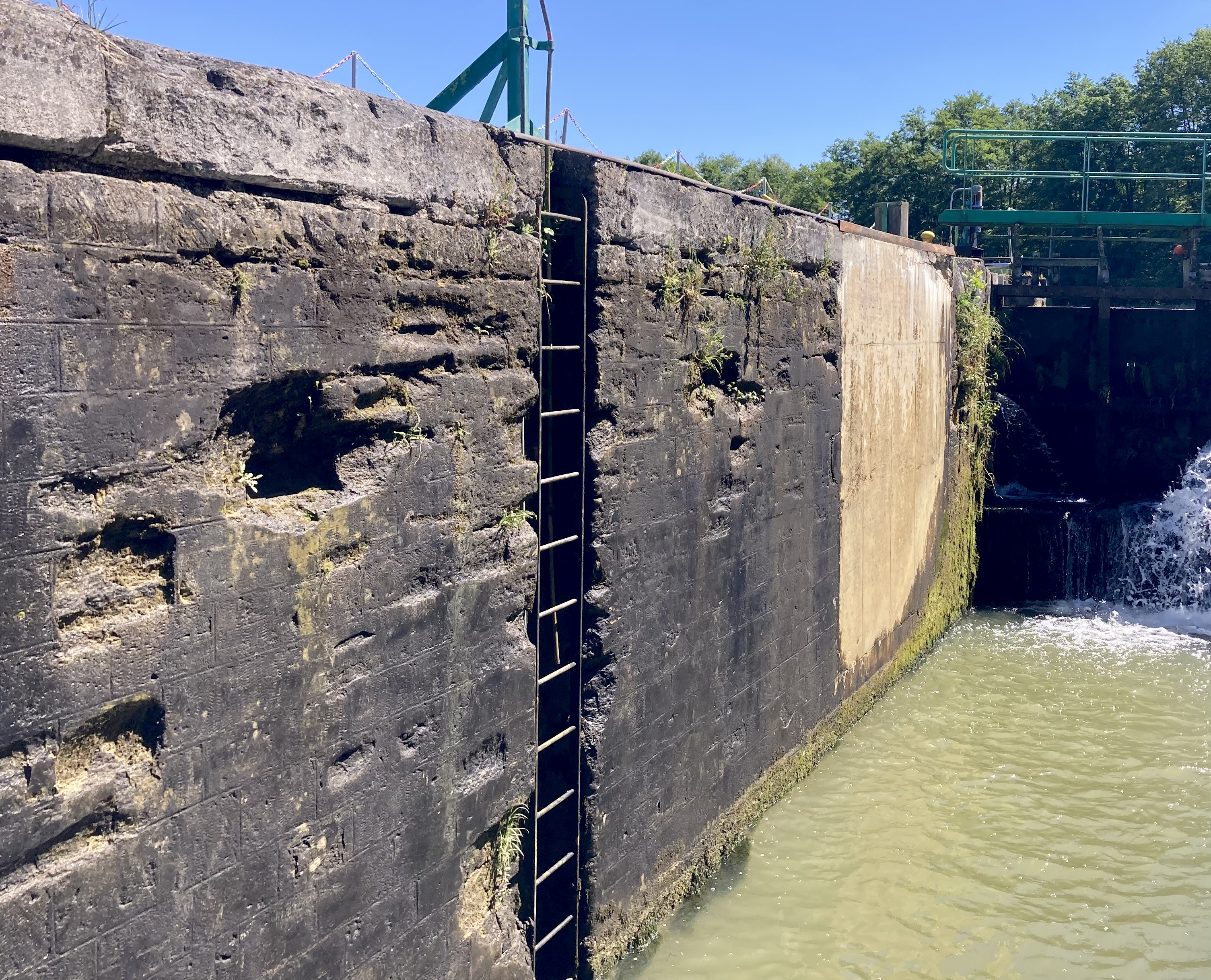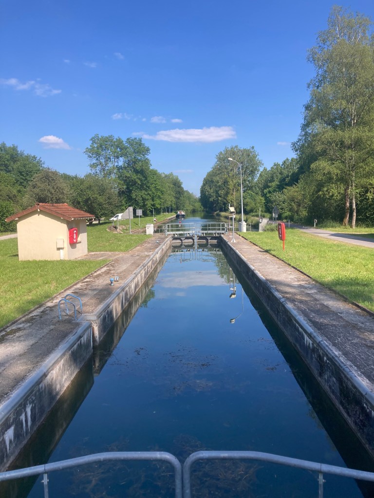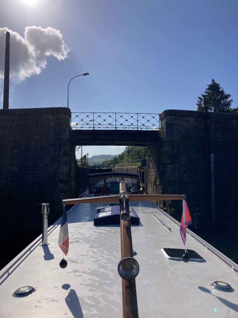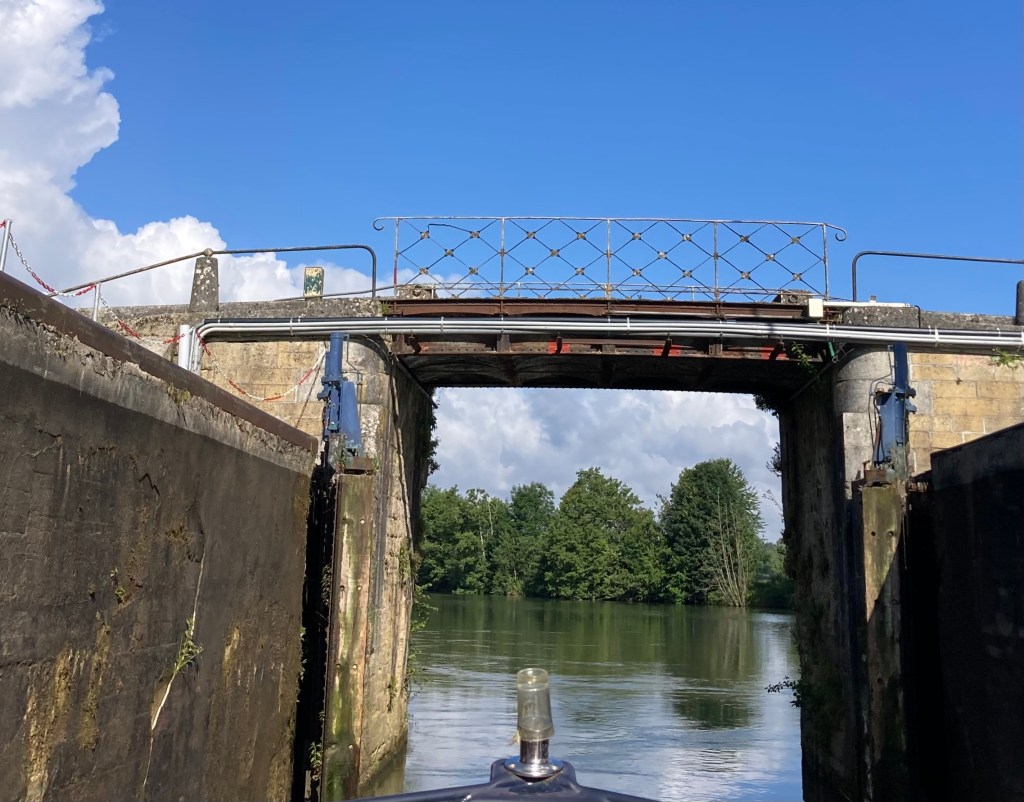 Our our last French lock for a while – les 4 Cheminées – was about twice as long and twice as wide as those we had been travelling through.
