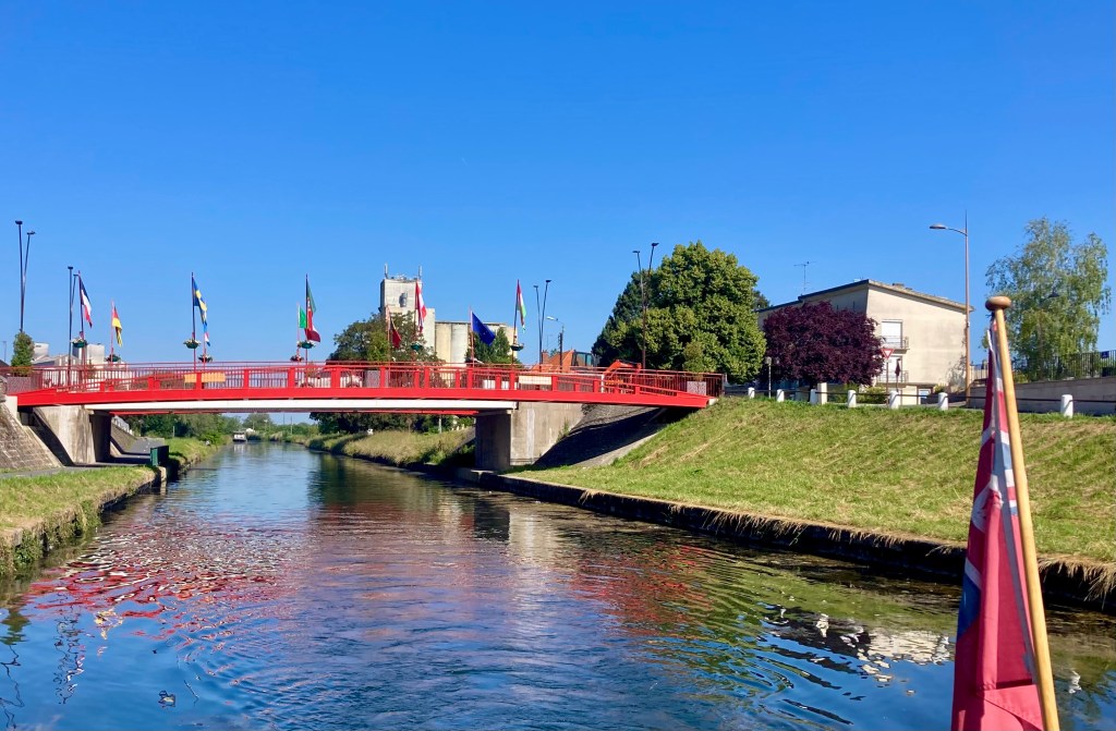 Before we reached Ham went past Aubrives – a village noted for its sculptor, George Favaudon. The riverbank is a perfect exhibition space for his work – not seen too well in the photo, but you can find out more about him and see this work close up at this link.