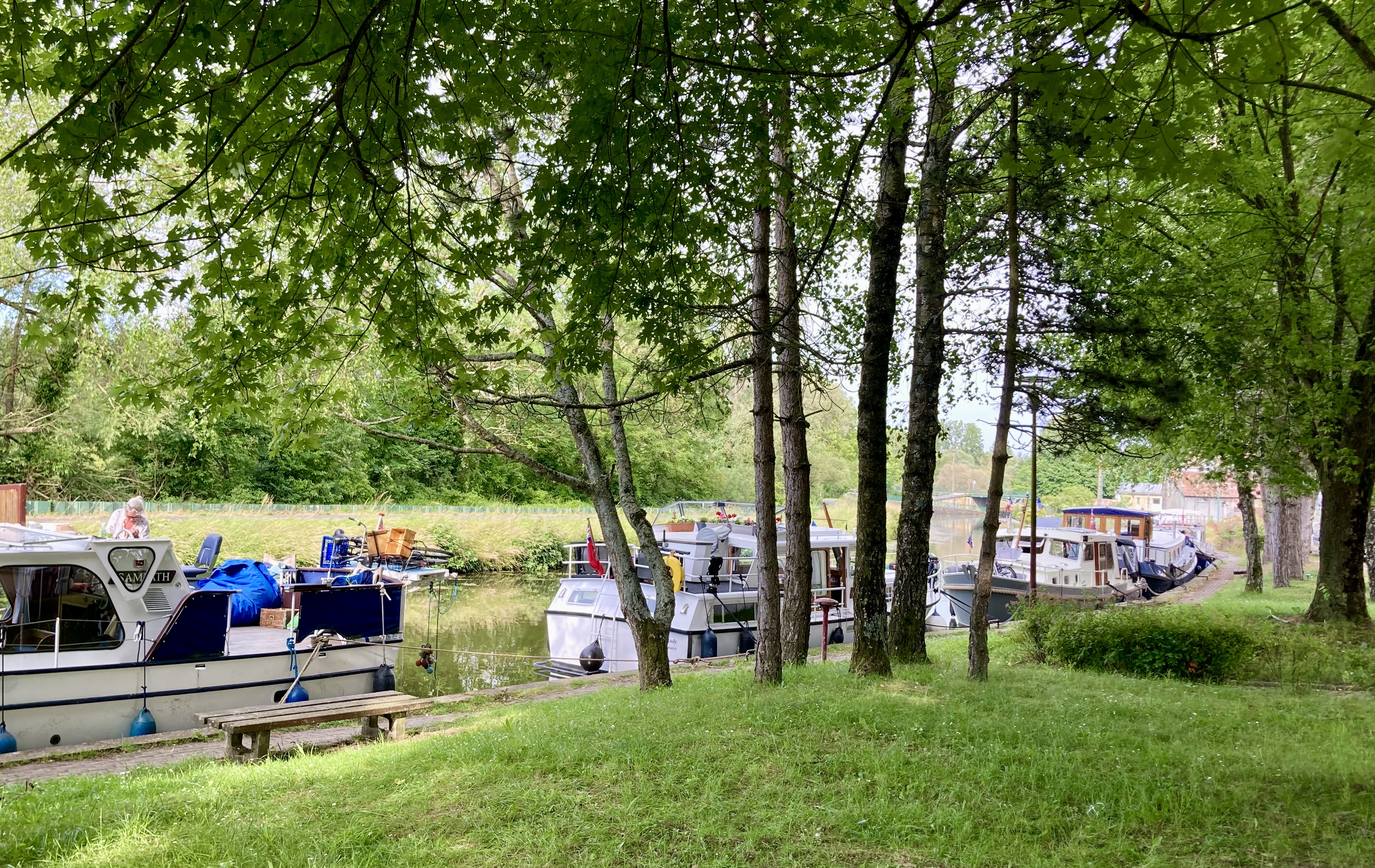 I show this second mooring as well in case you are ever looking to moor in Charleville. We are right at the back of a long pleasant shaded pontoon, with plentiful bornes for water and electricity. There is a well run camper van site almost alongside and the reception for the latter also acts as Capitainerie. It’s where you go to pay your mooring fee etc.