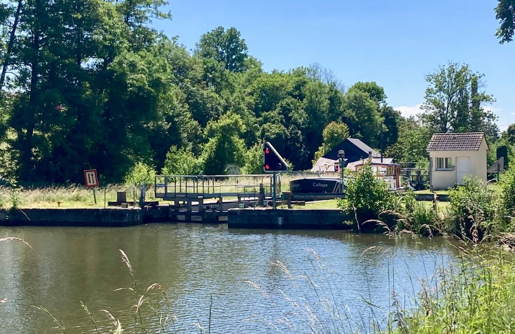 As we had not stopped at Revin we had a shorter cruise to the next night’s stop – just 16.5kms. The locks open at 0900 and we were so close we could wait until the lights came on, cast off, and by the time Captain Stu had turned Calliope round to face downstream again the lock gates were open.