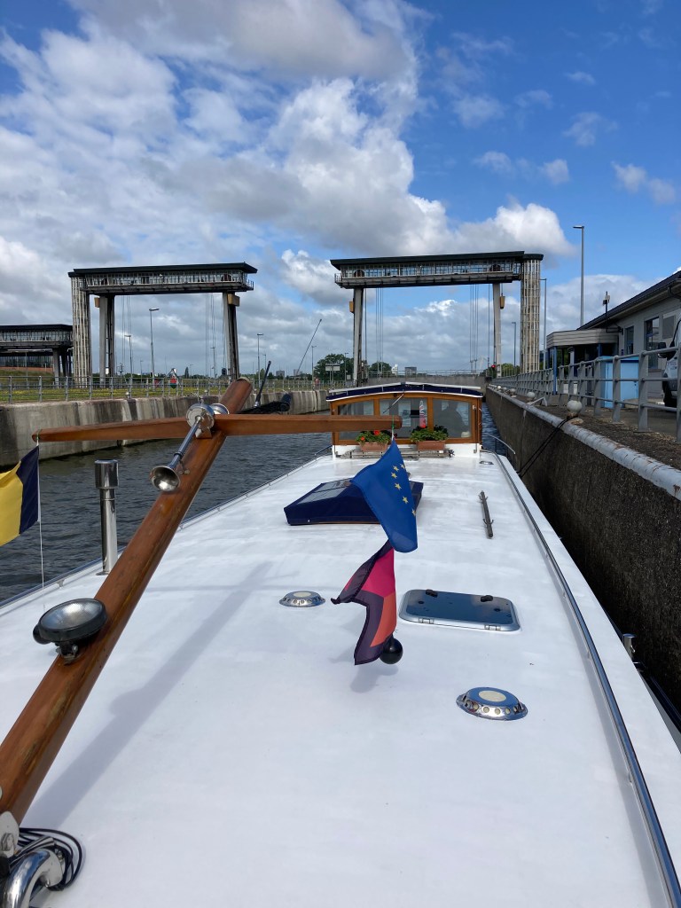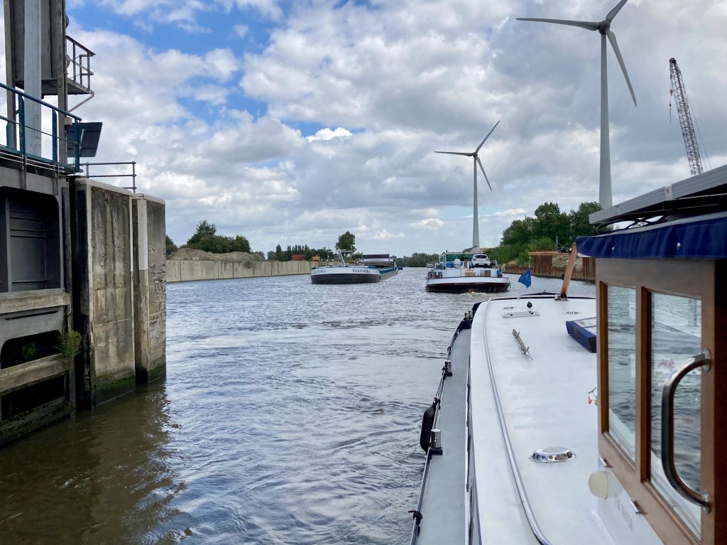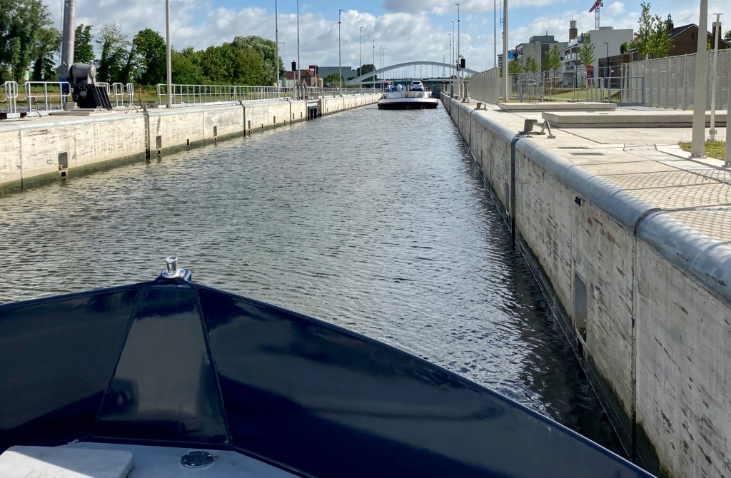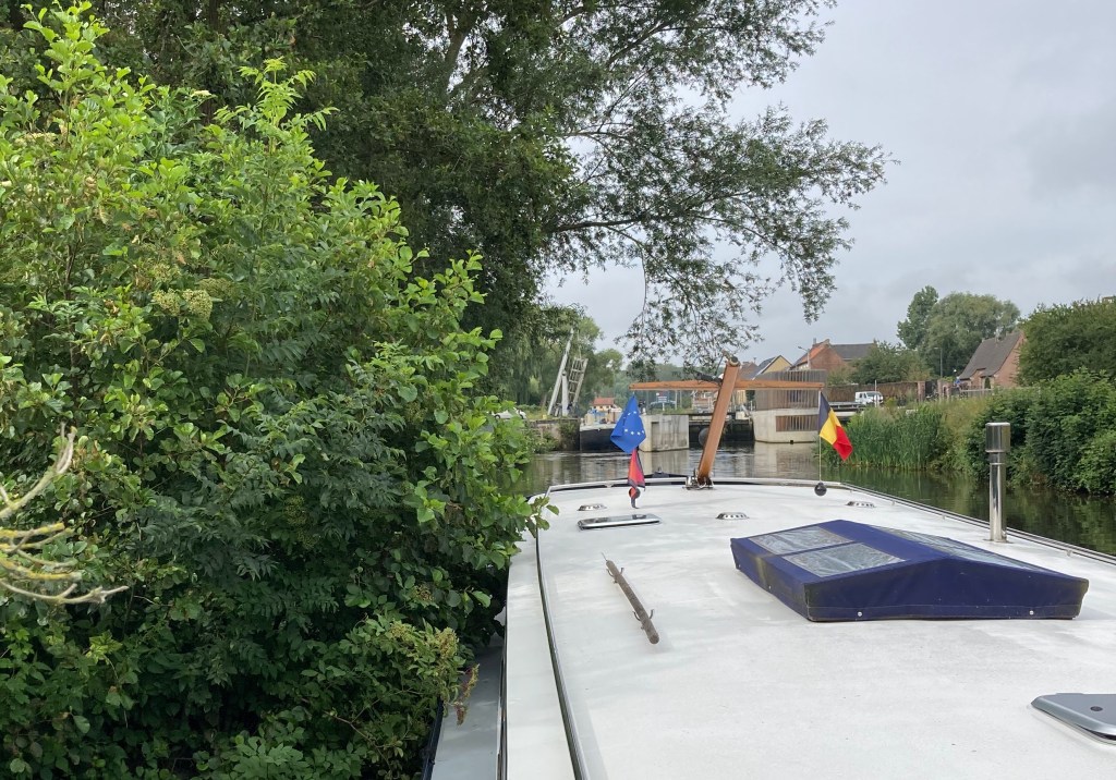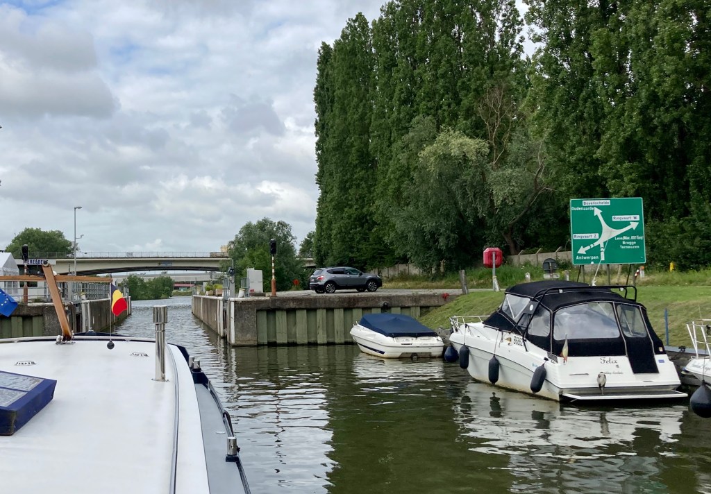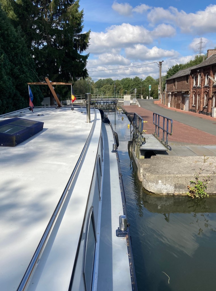 Only two kilometres on and we were at the Monsin lock where we could rejoin the Meuse (or Maas as it is called in Flandria) for a while, away from the hectic swirl of commercial traffic – not that bad really!). We had not realised that this lock only operates three times as day, and that we had three hours to wait, in the shade. It was also our official entry to Flandria from Wallonia so much paperwork ensued in the lock office!