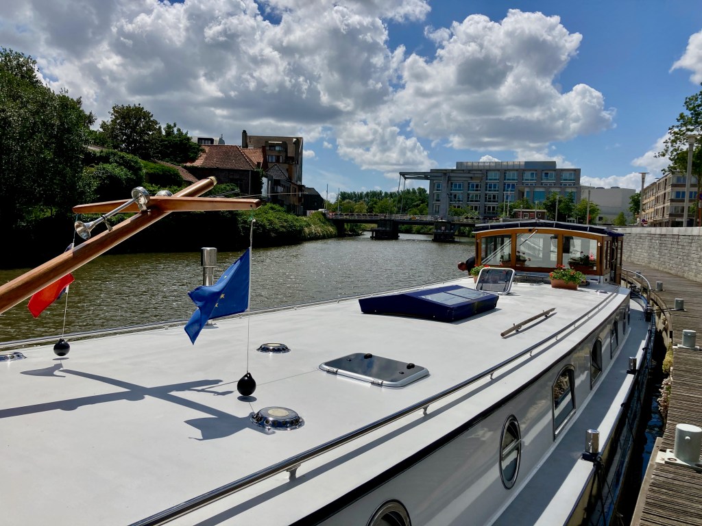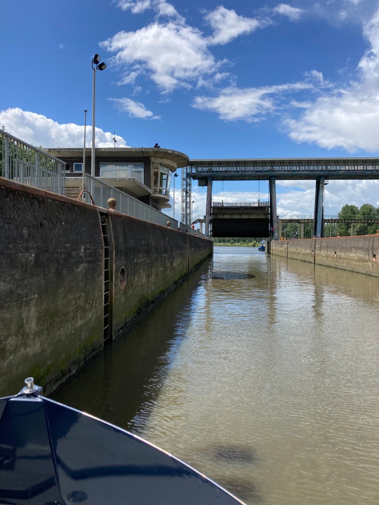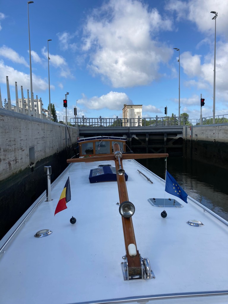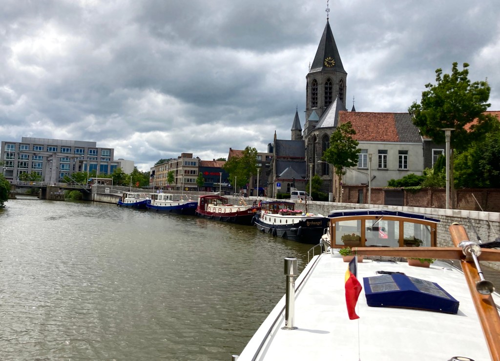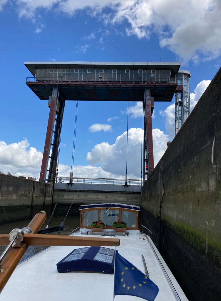 Only two kilometres on and we were at the Monsin lock where we could rejoin the Meuse (or Maas as it is called in Flandria) for a while, away from the hectic swirl of commercial traffic – not that bad really!). We had not realised that this lock only operates three times as day, and that we had three hours to wait, in the shade. It was also our official entry to Flandria from Wallonia so much paperwork ensued in the lock office!