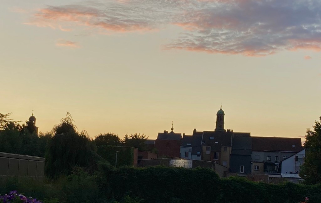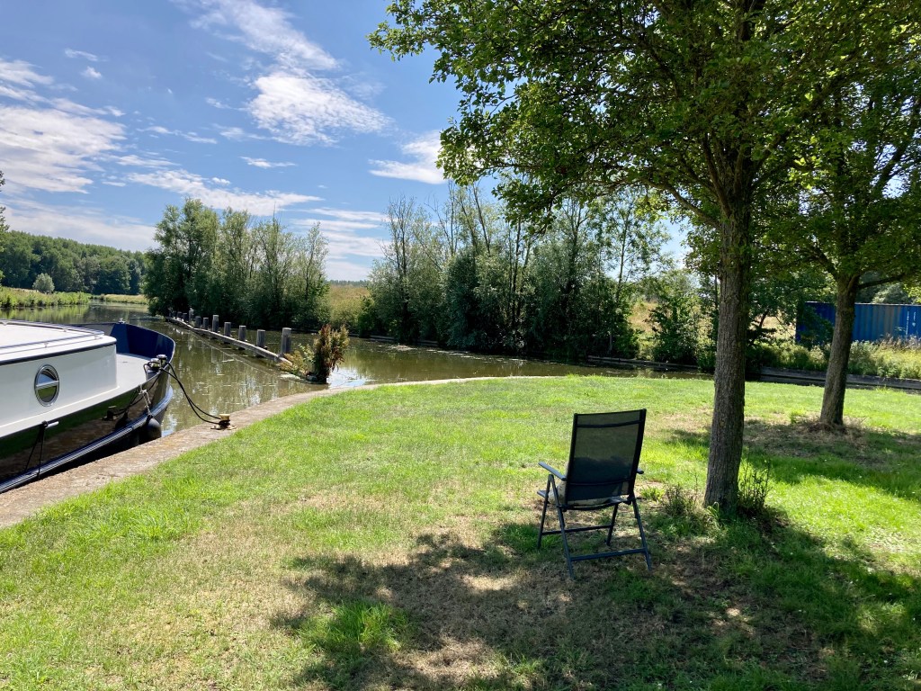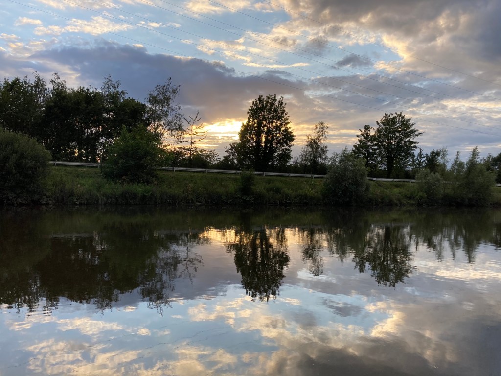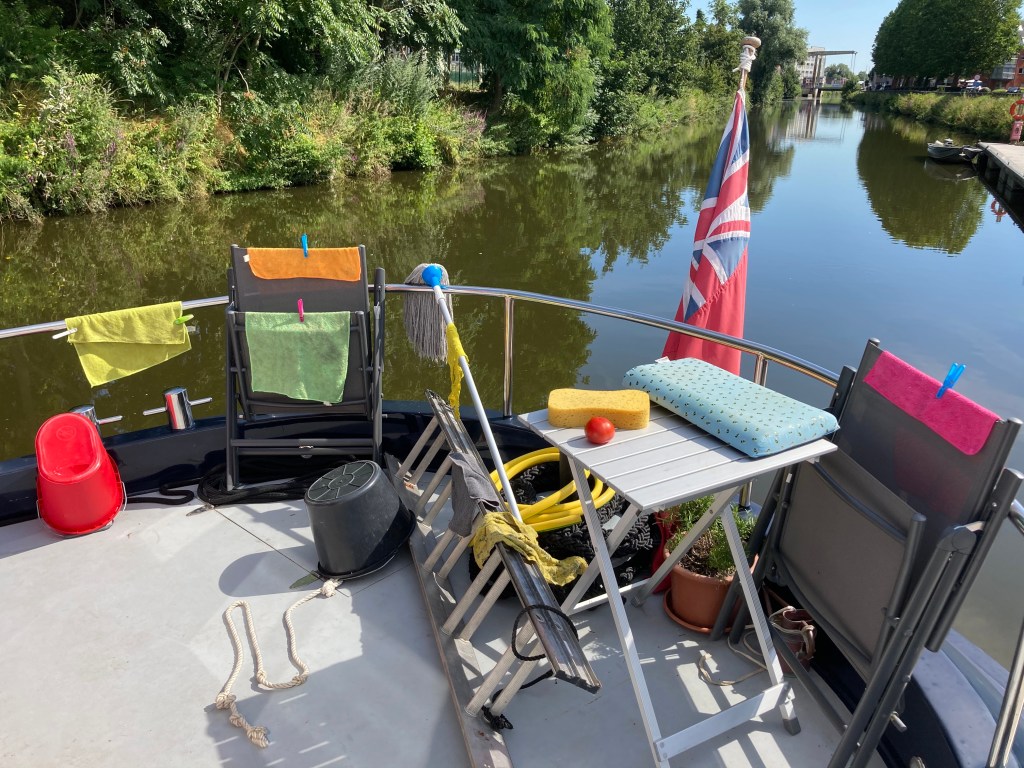 Evenings were lovely on the back deck, finally in the shade after hot hot days. Our mooring was at the junction with the Ourthe river, here disappearing South through a bridge.