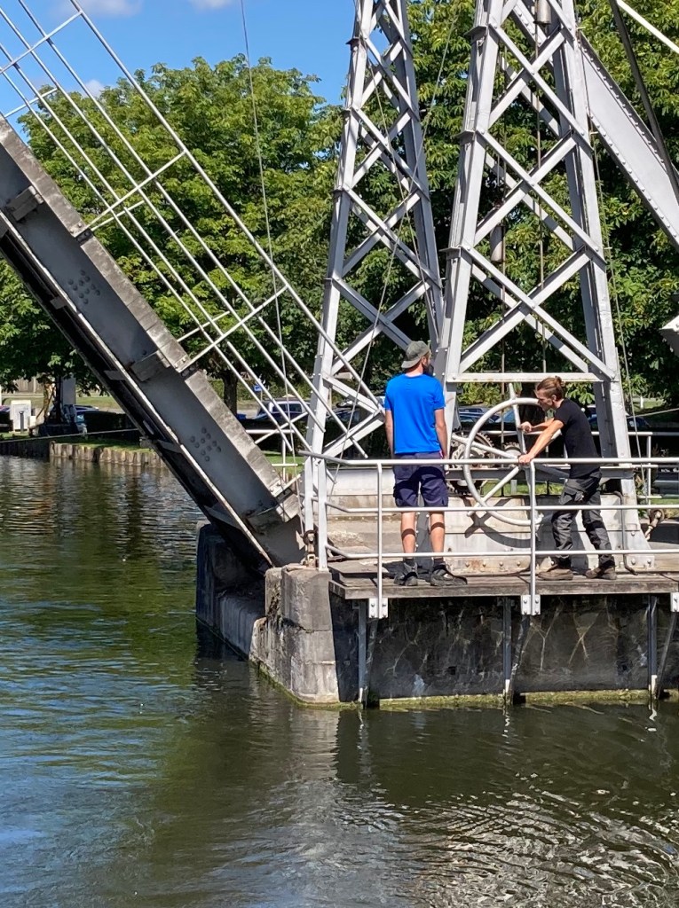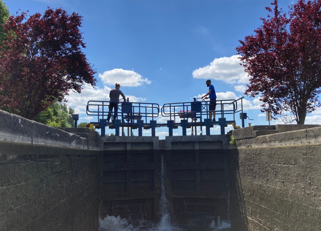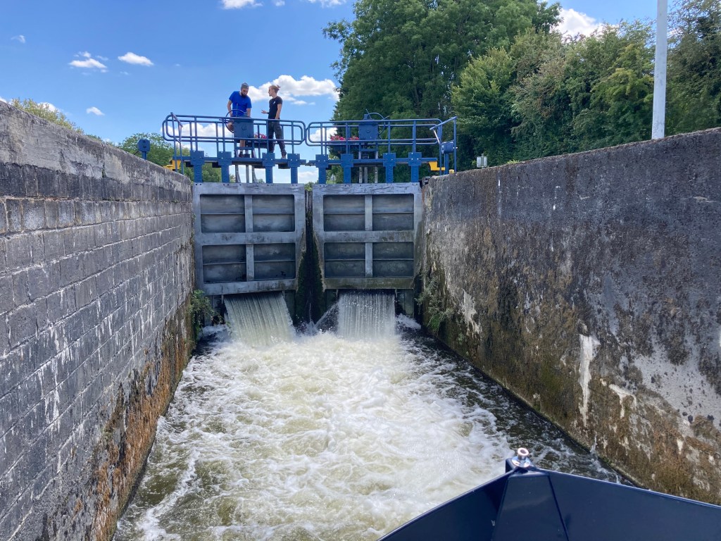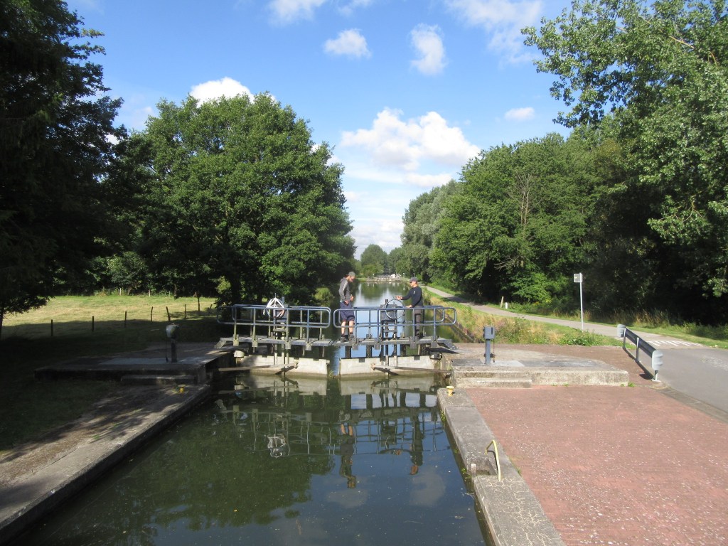 We had two locks to go through and we were very pleased to have the assistance at the first, where the bollards were widely spaced and also the ropes needed to be re-hung at different levels as we went down. Someone had had greater problems than us in this lock – the lock door is the type that rises from under the water. It looks like someone did not wait long enough and tried to drive over it!