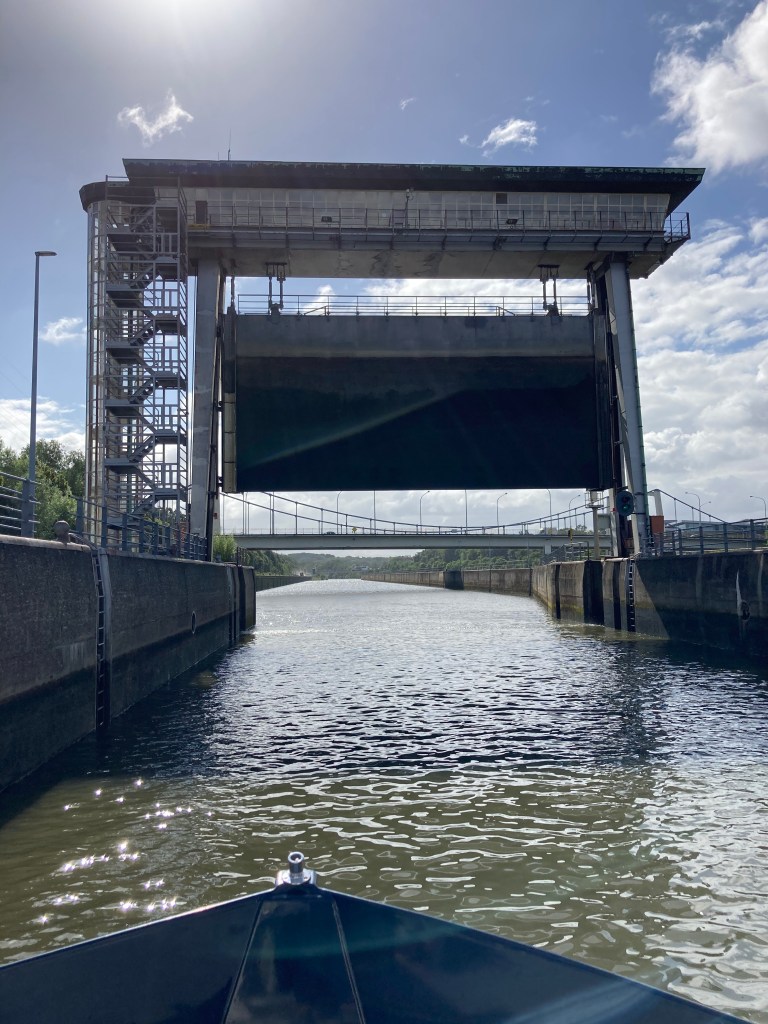Now it was time to move a lot further downstream, to Liège. The days cruising only included one lock, but for that one we had a bit of a wait outside and then a bit more inside, as so often happens. It was all very gentle and pleasant, this time with unbroken railings on the upstream gate, and nice floating bollards to ease our descent.